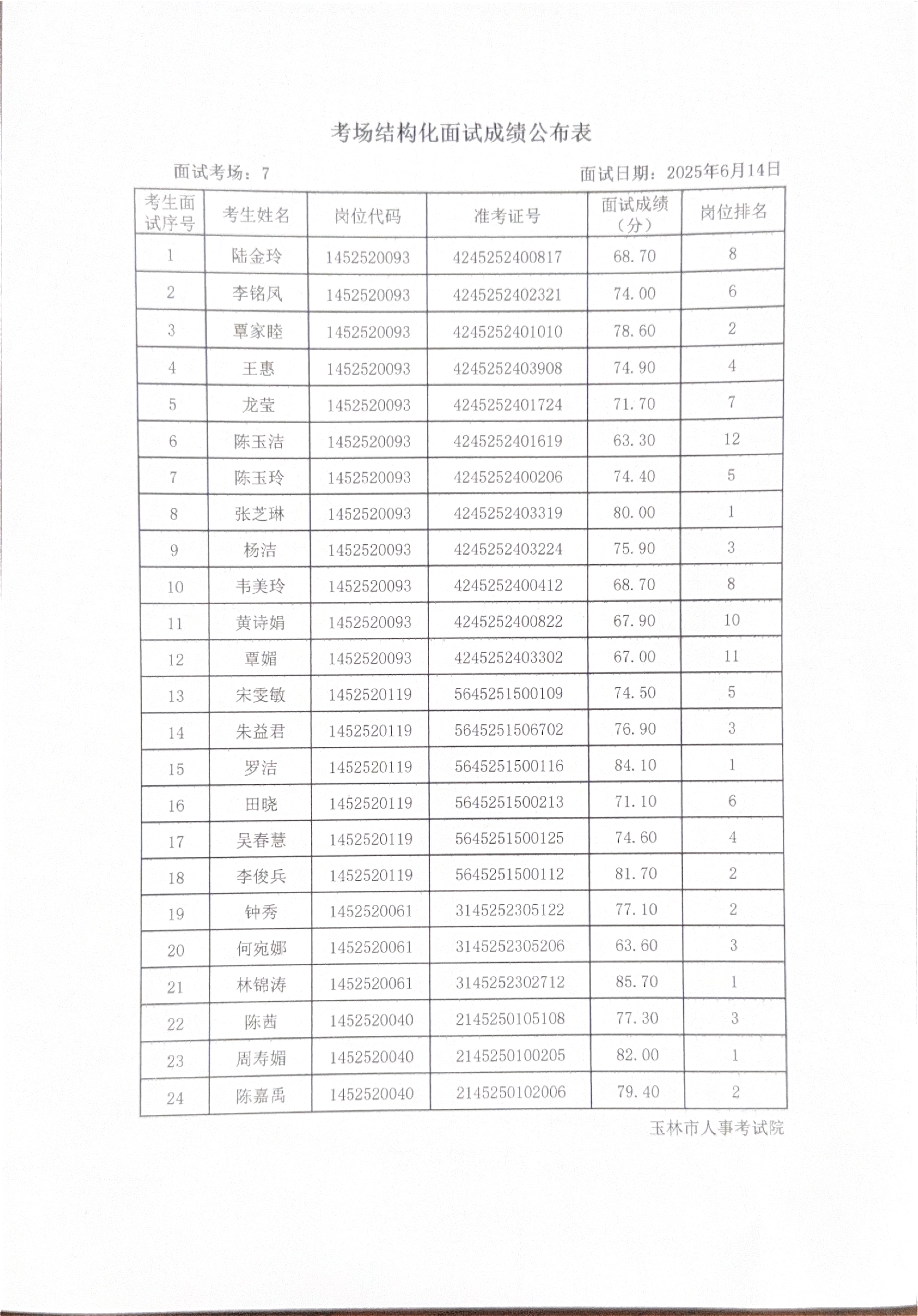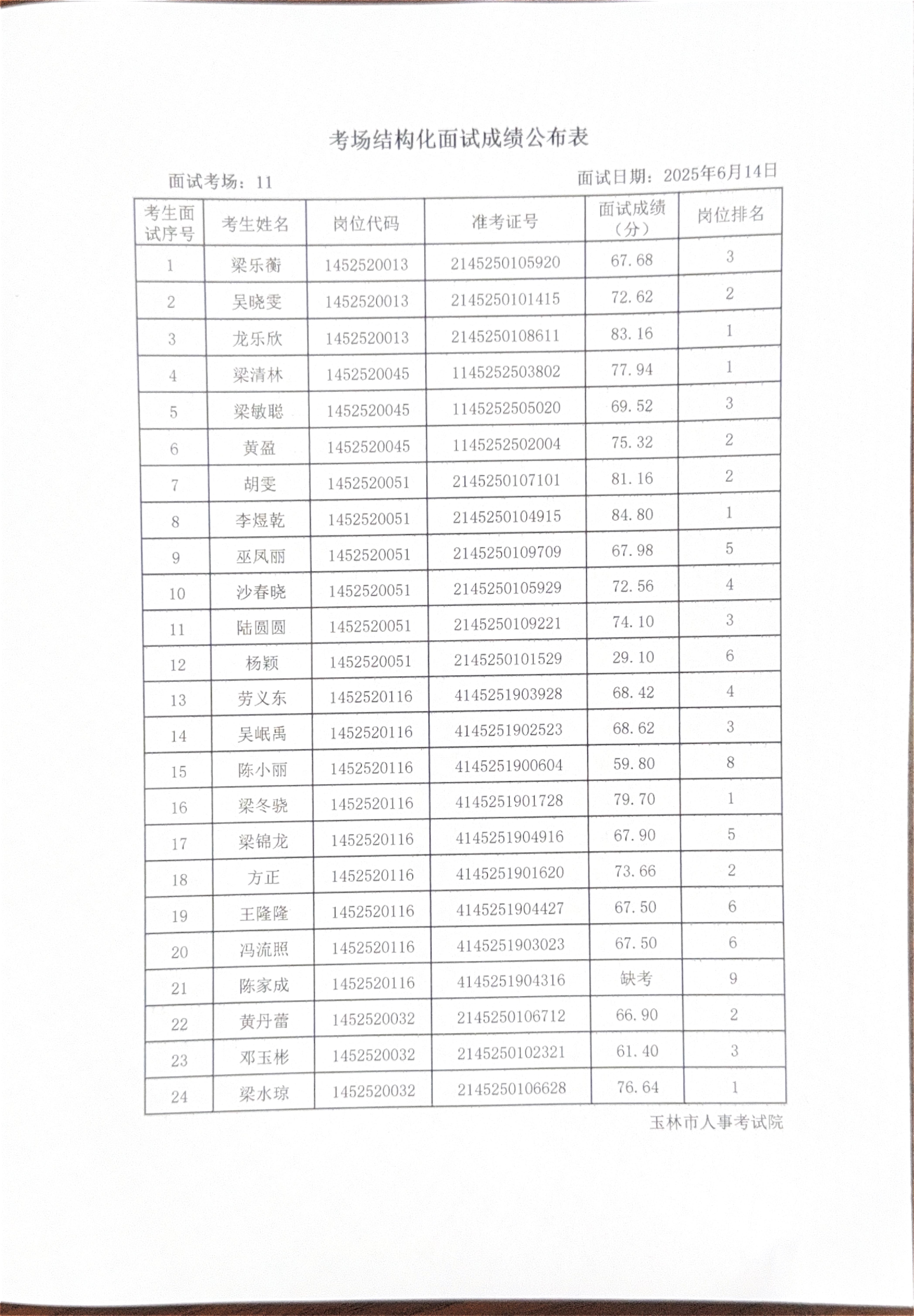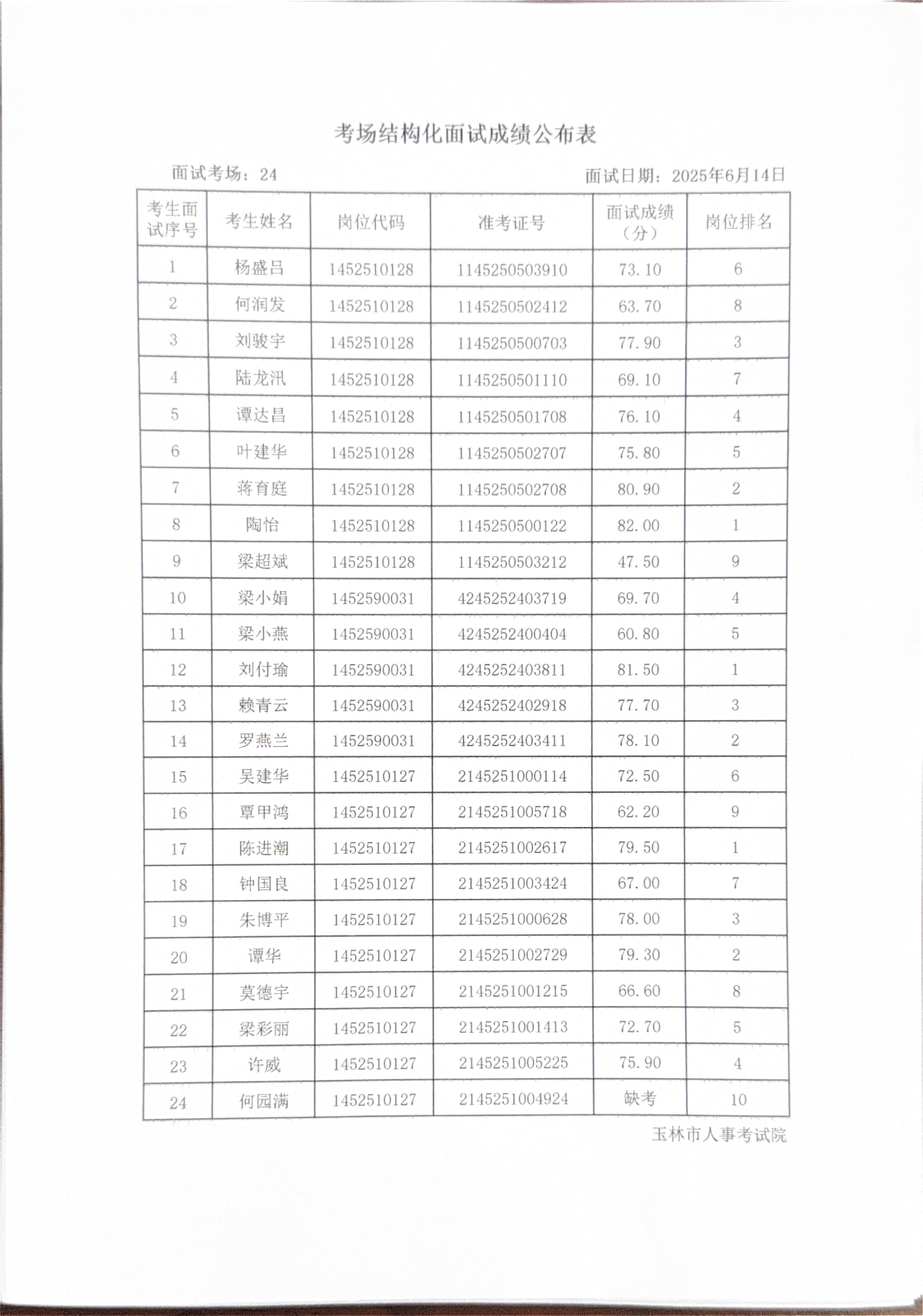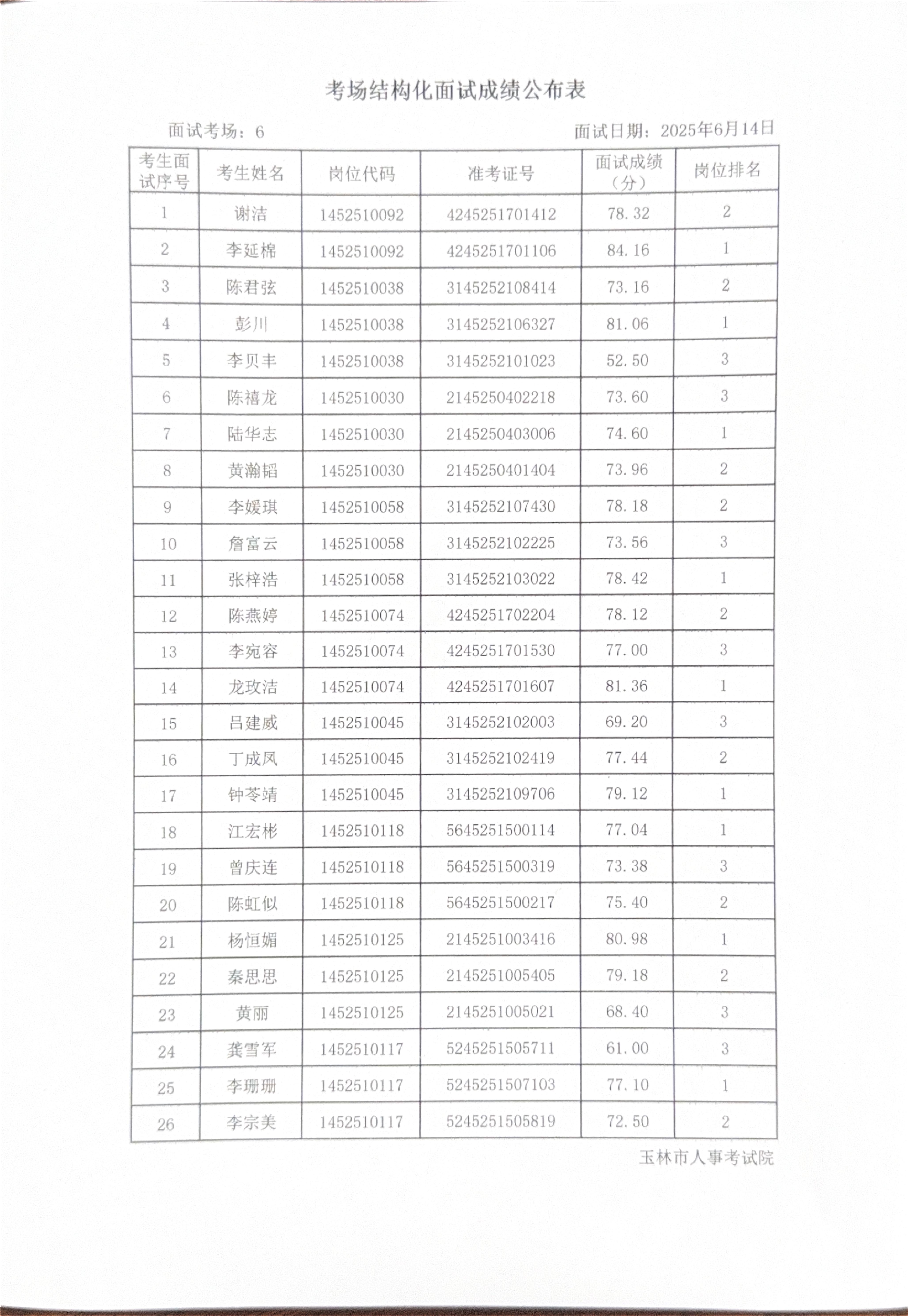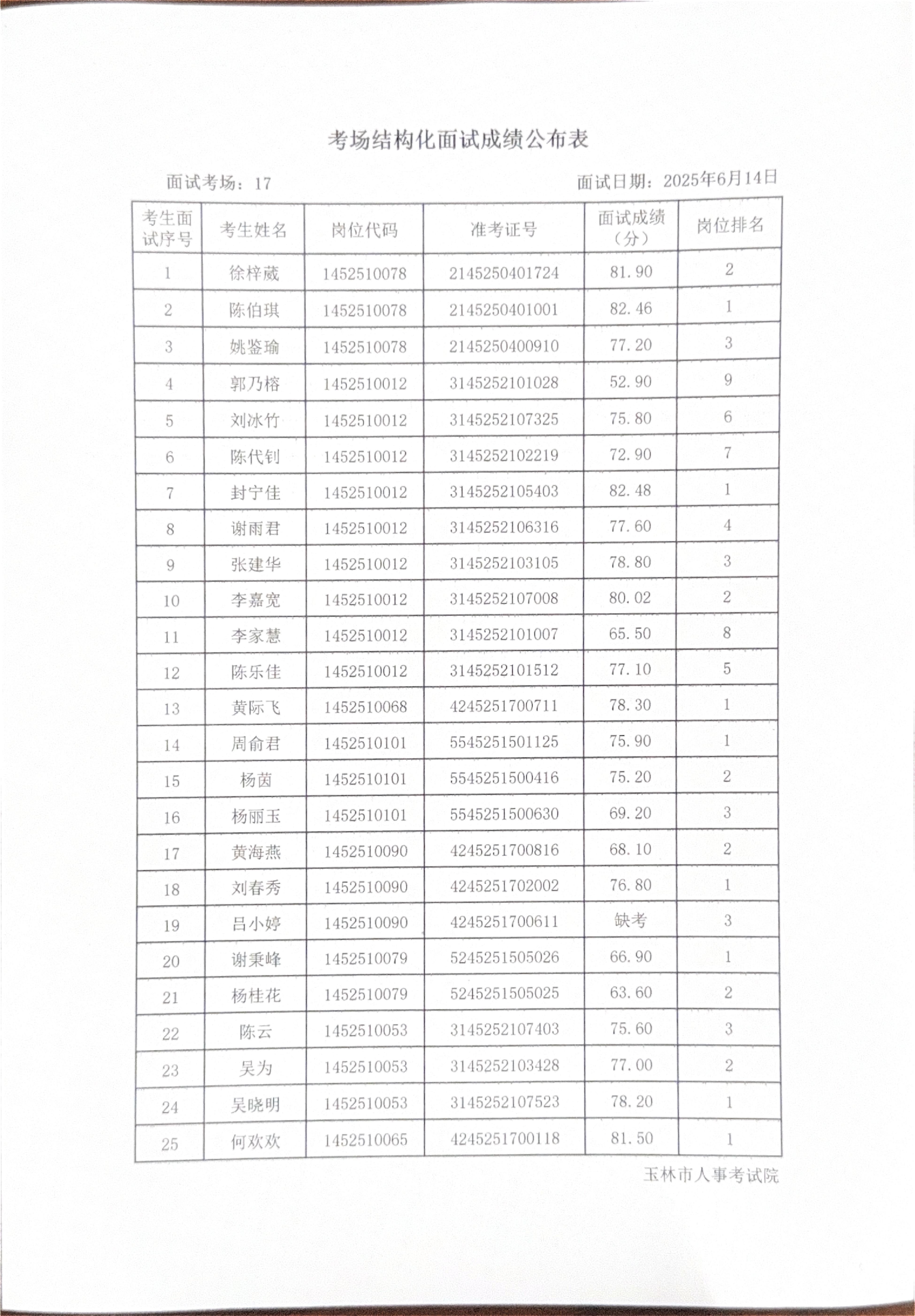 玉林市2025年度上半年市直(含玉州区、福绵区、玉东新区)事业单位公开招聘人员面试成绩公布(6月14日)