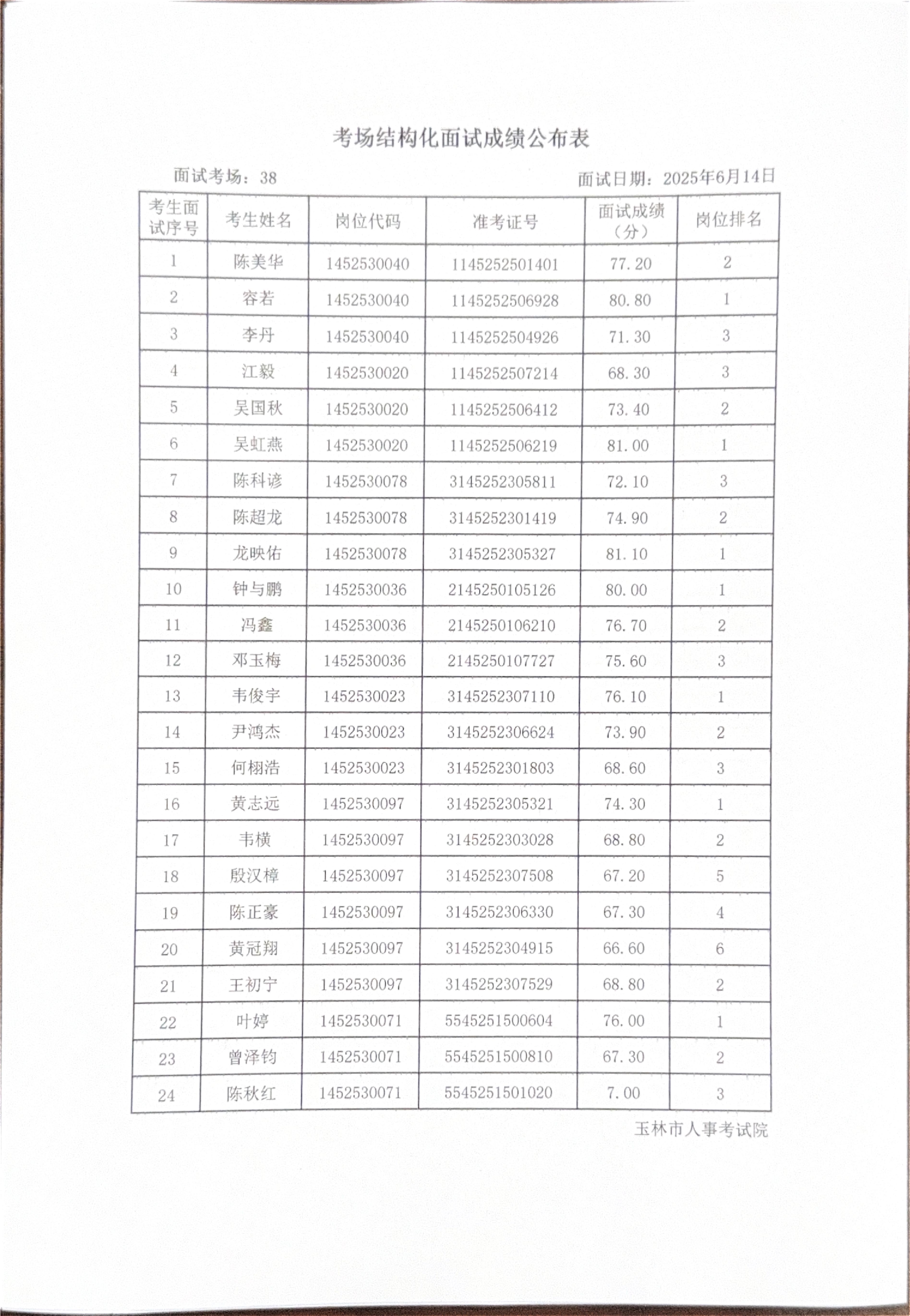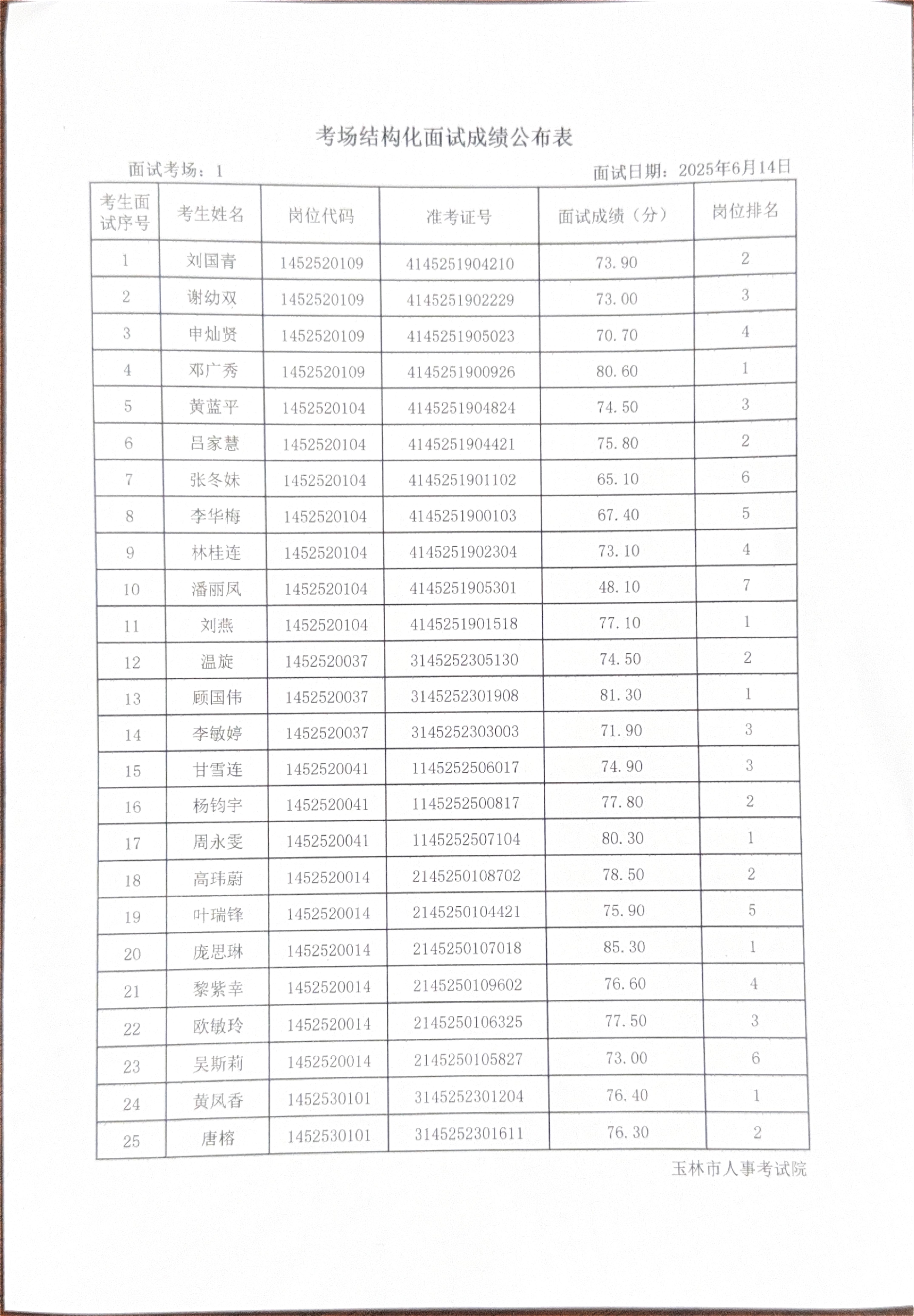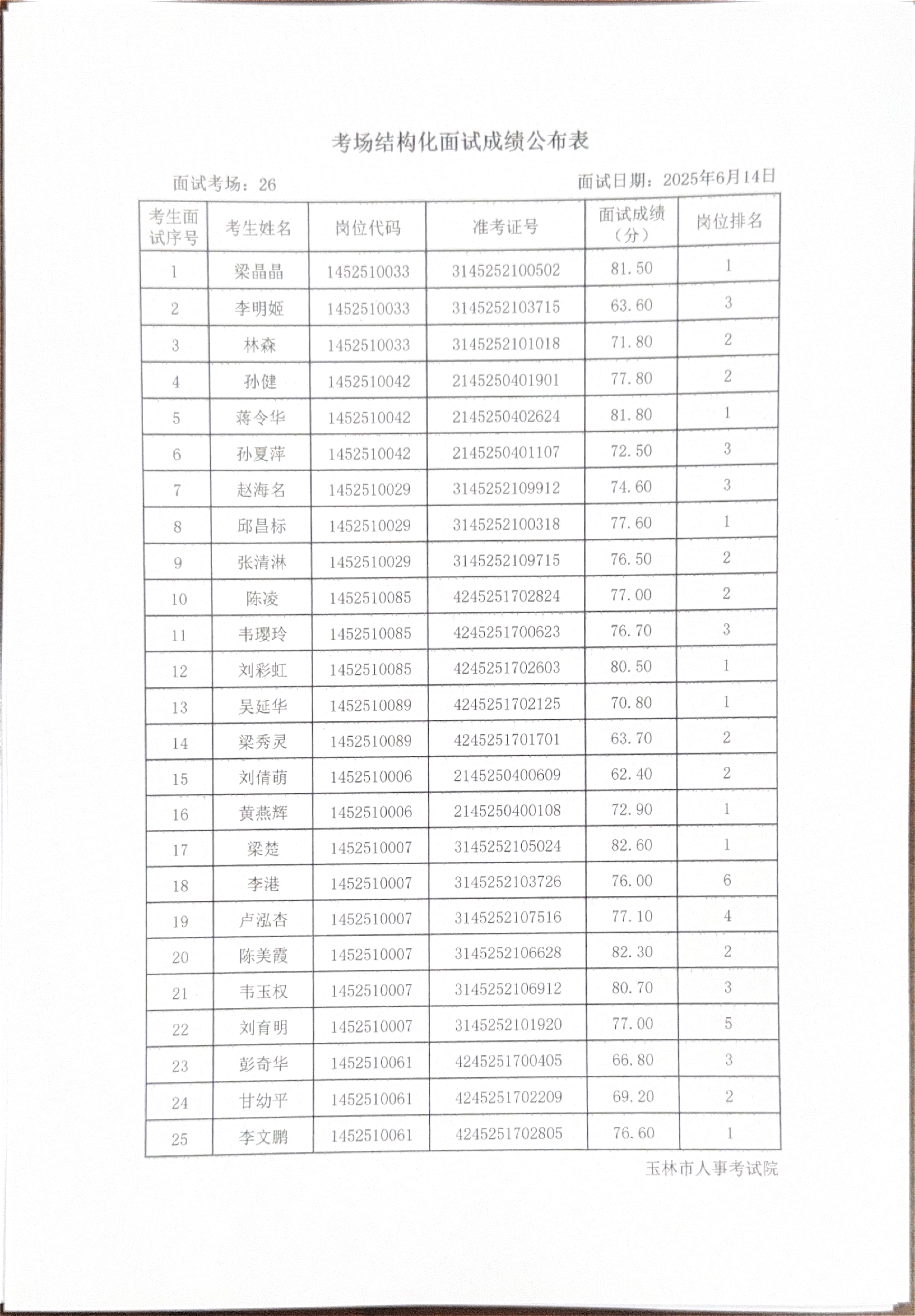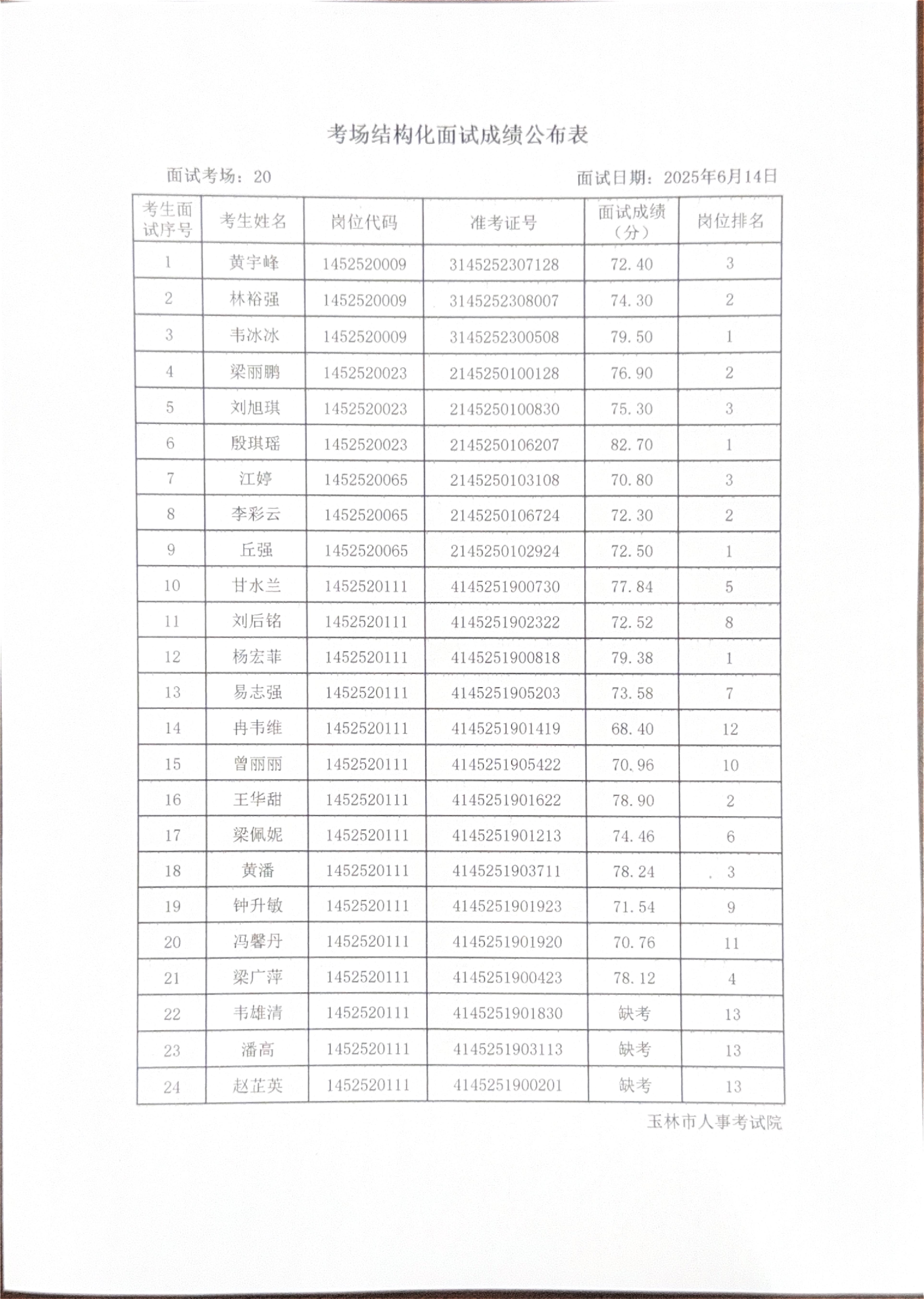 玉林市2025年度上半年市直(含玉州区、福绵区、玉东新区)事业单位公开招聘人员面试成绩公布(6月14日)