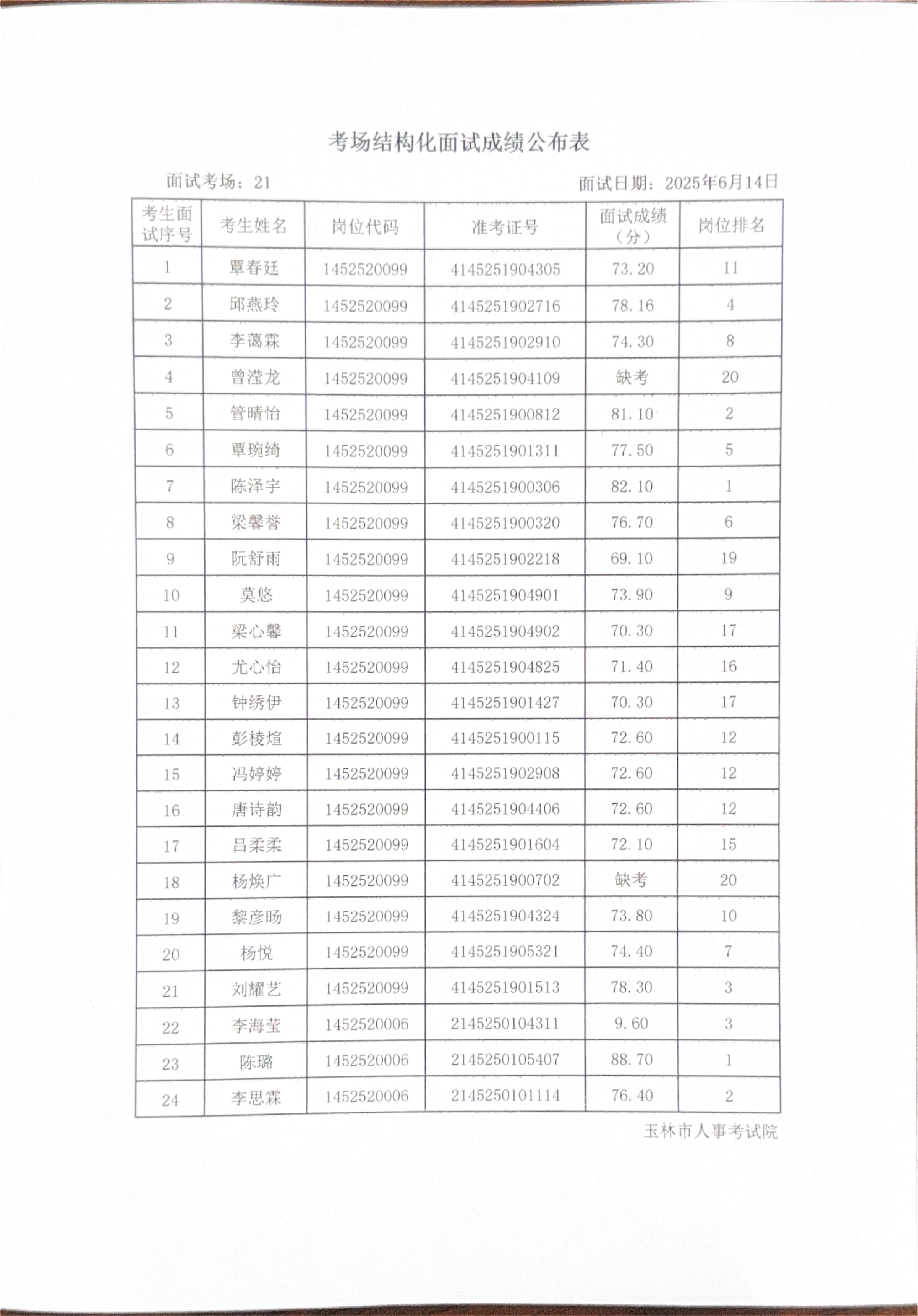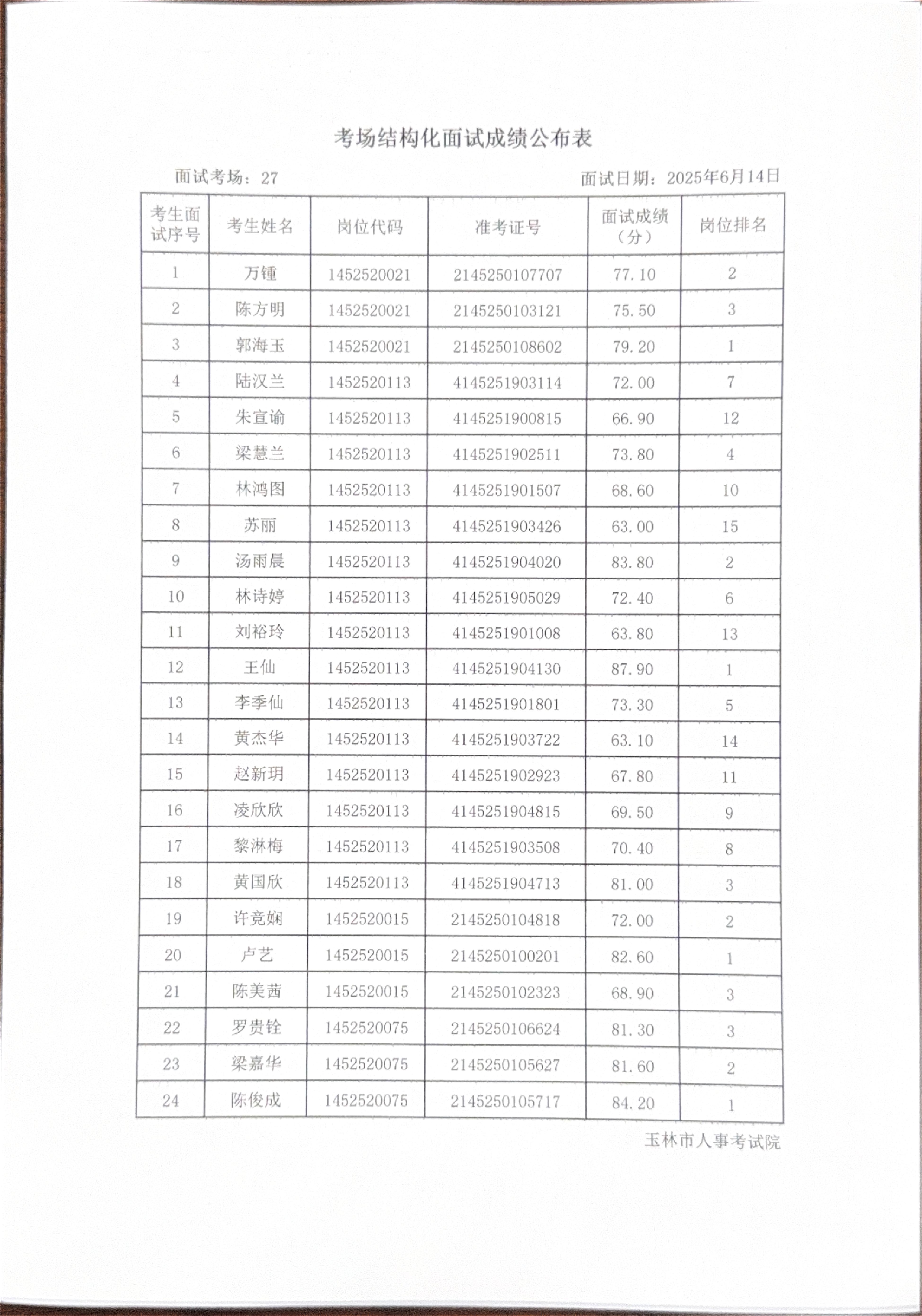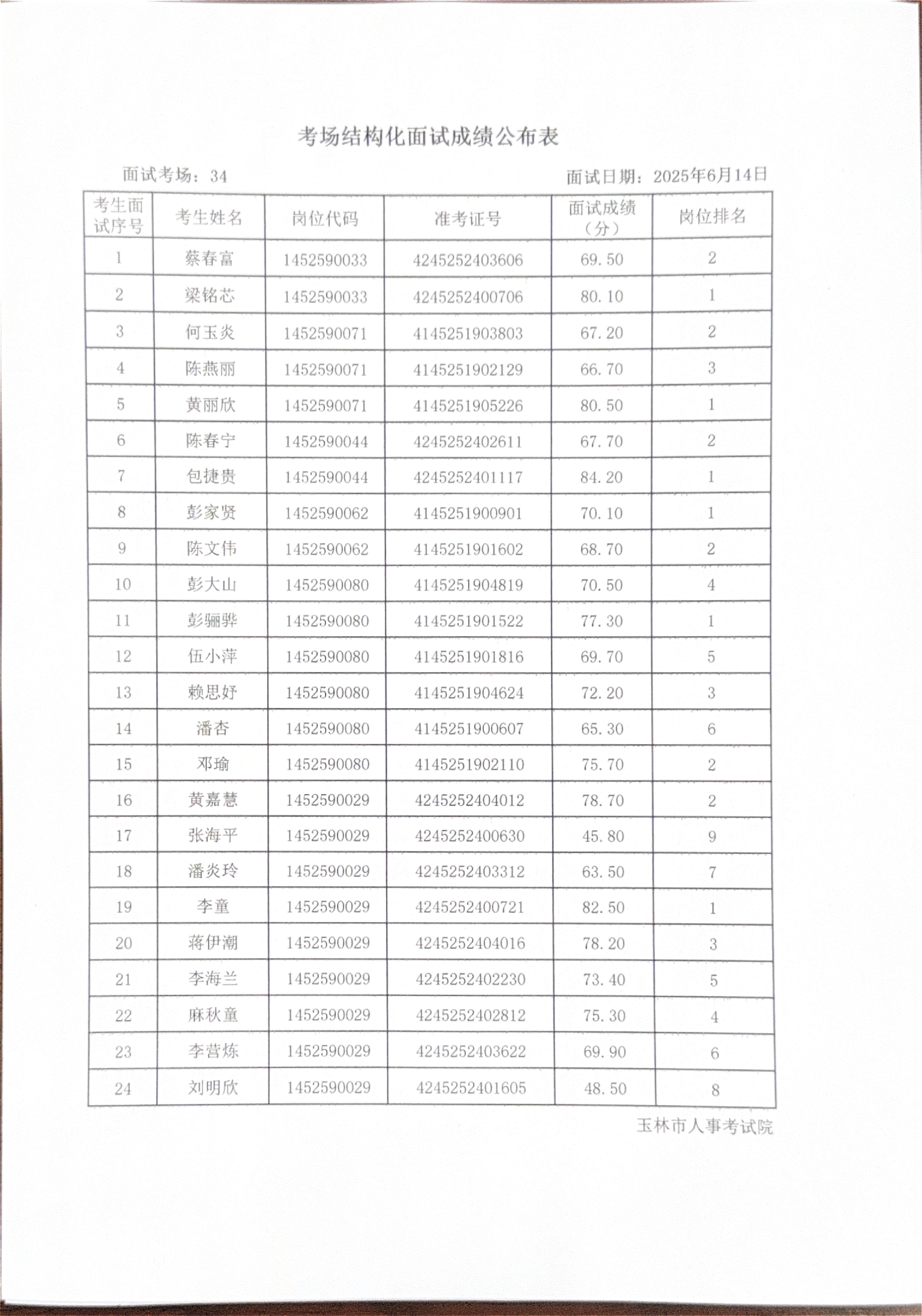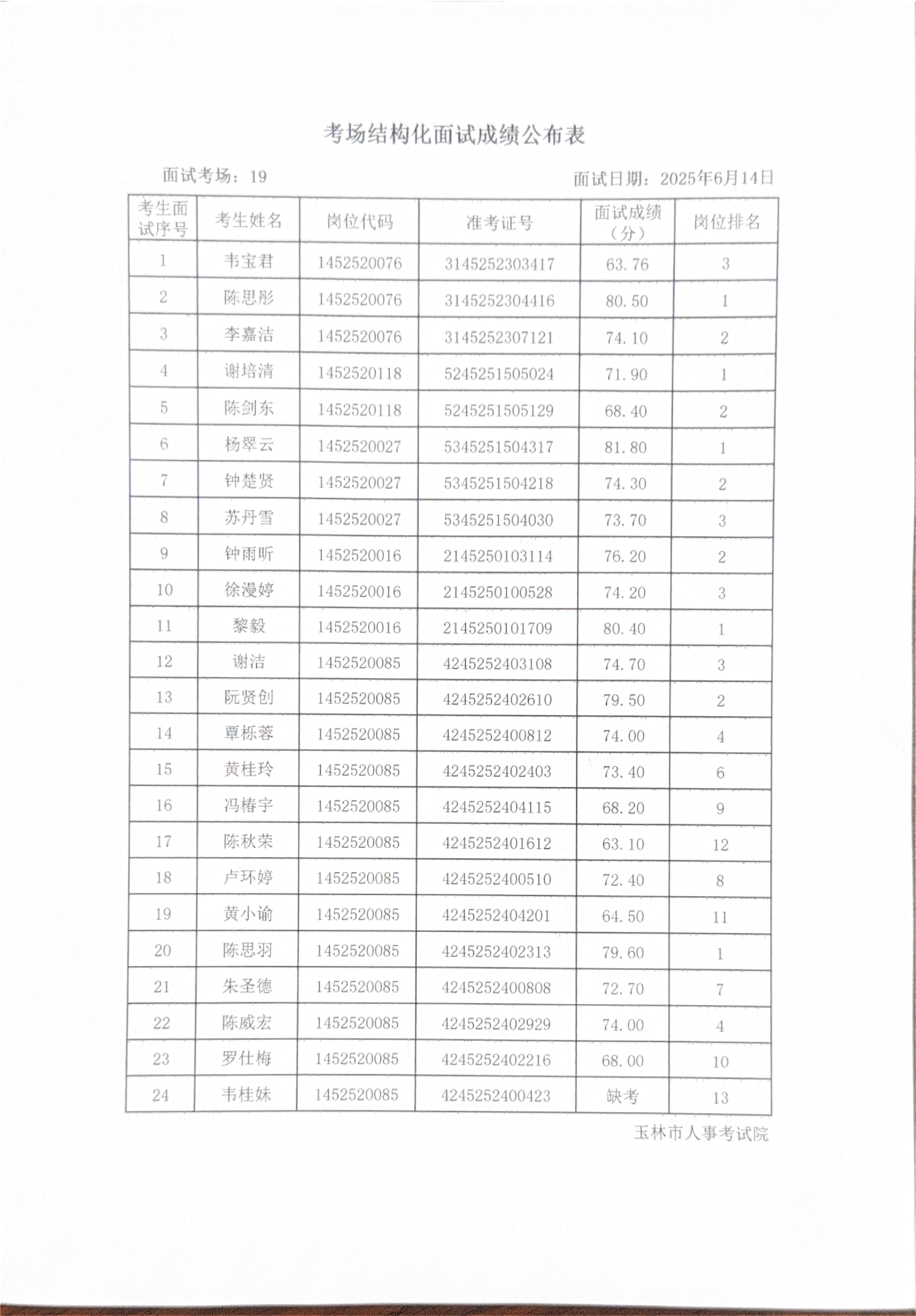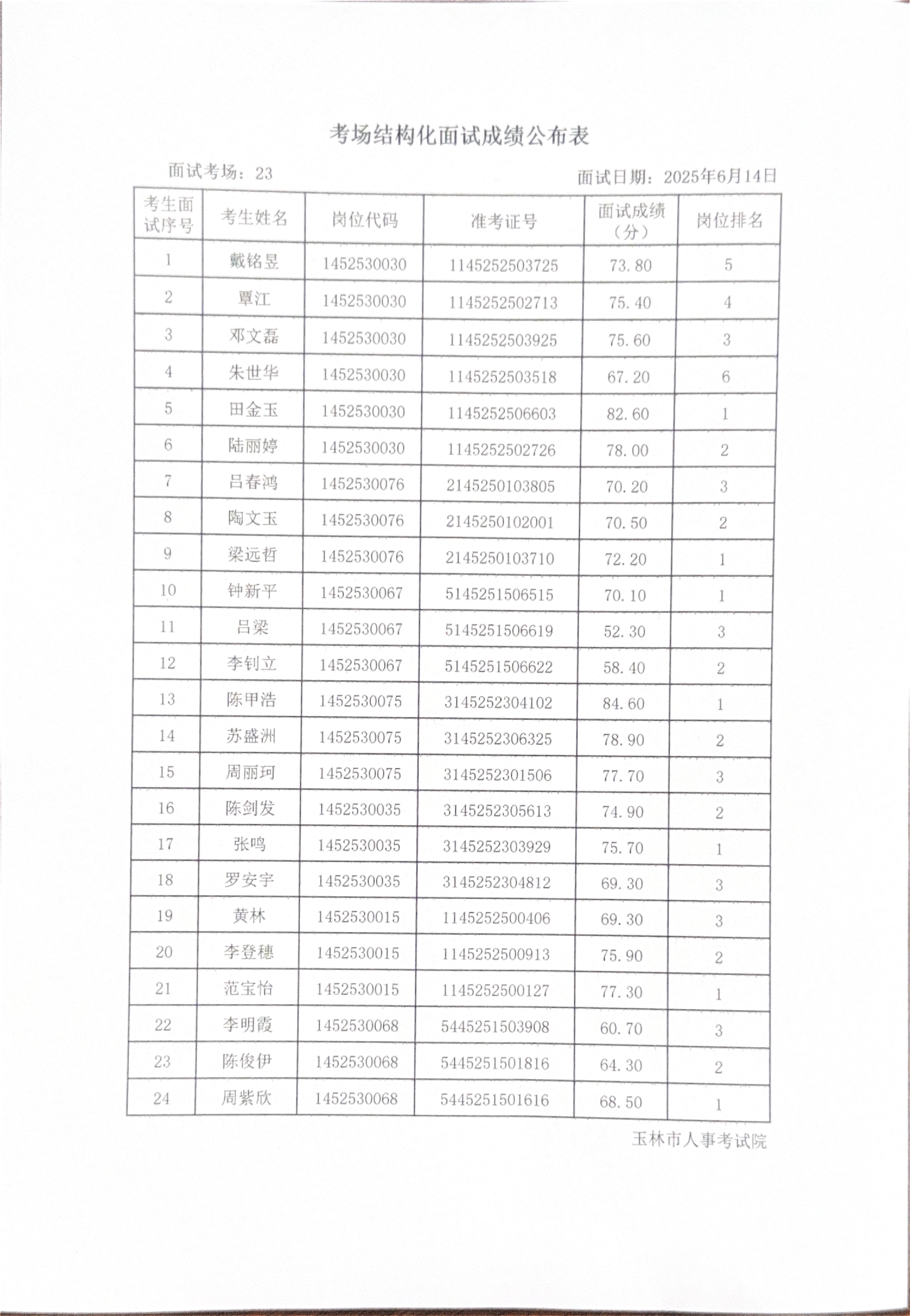 玉林市2025年度上半年市直(含玉州区、福绵区、玉东新区)事业单位公开招聘人员面试成绩公布(6月14日)