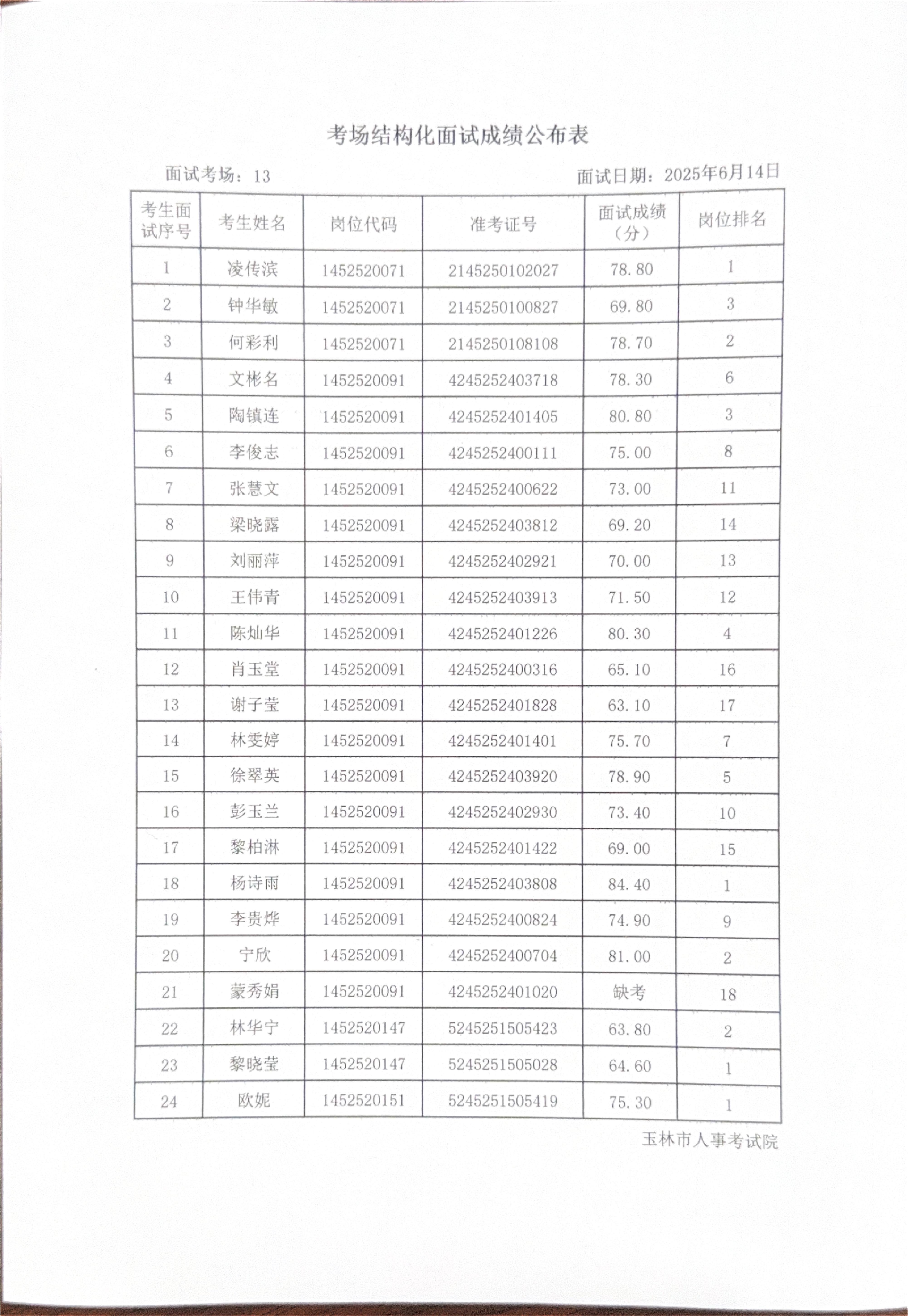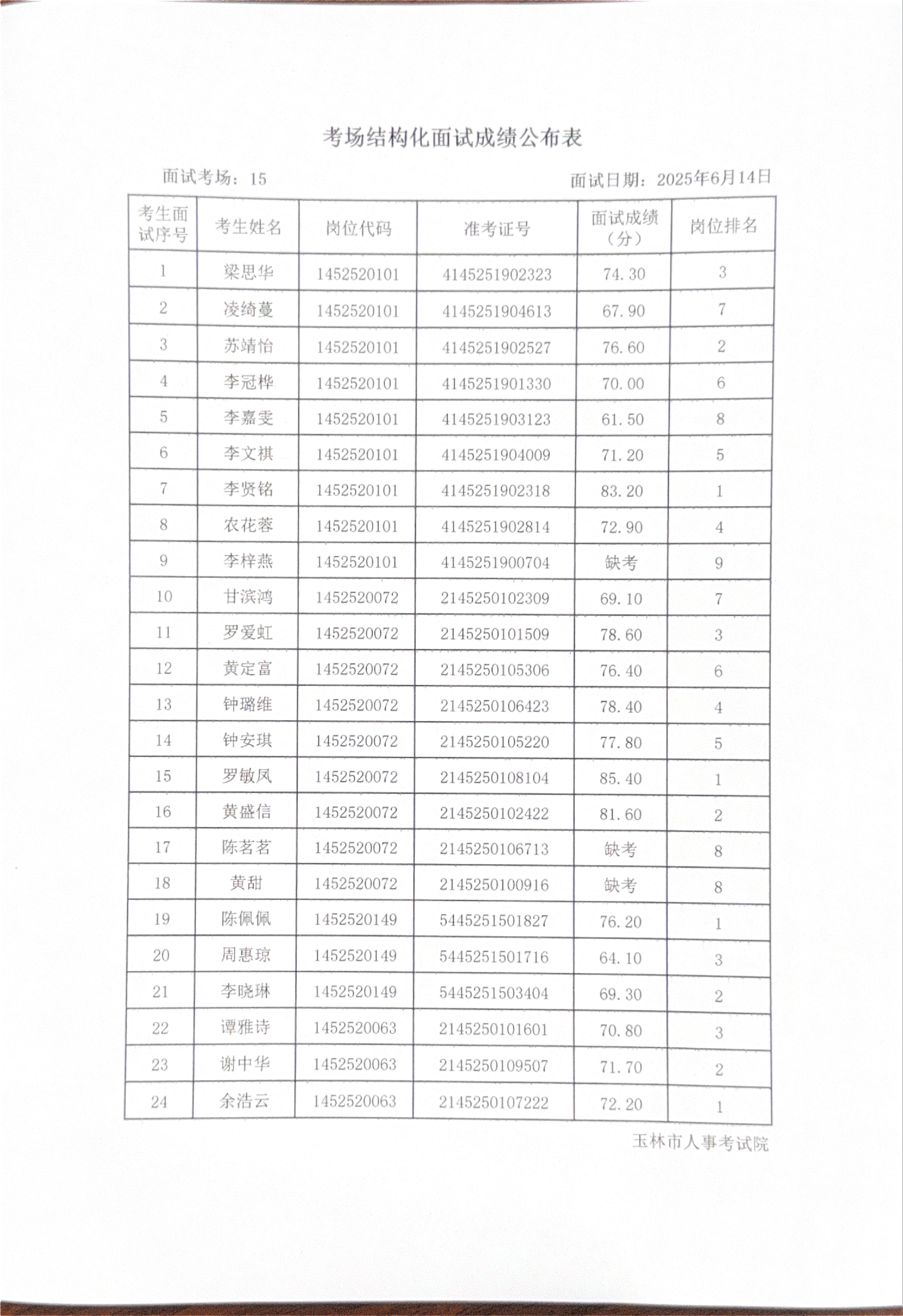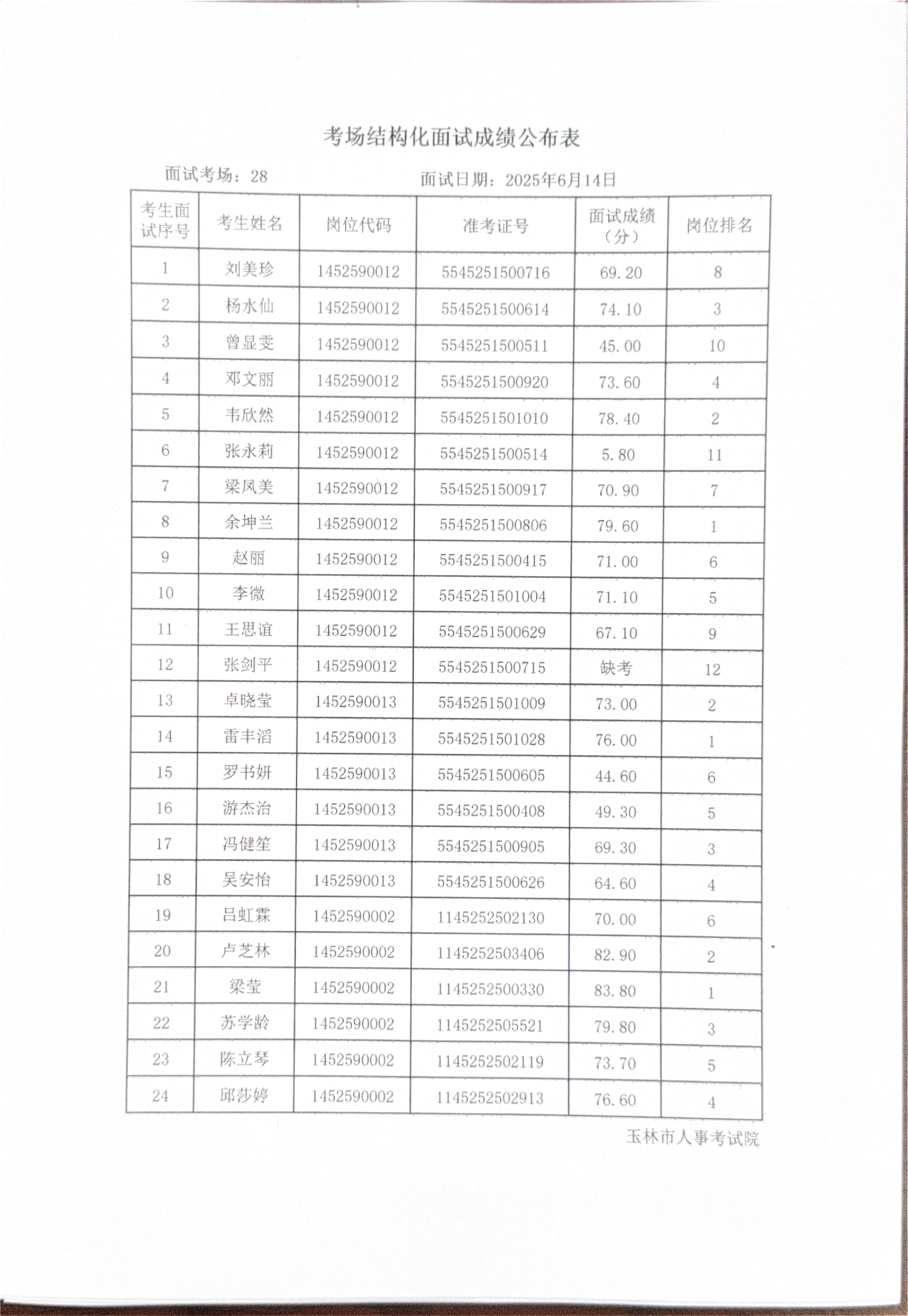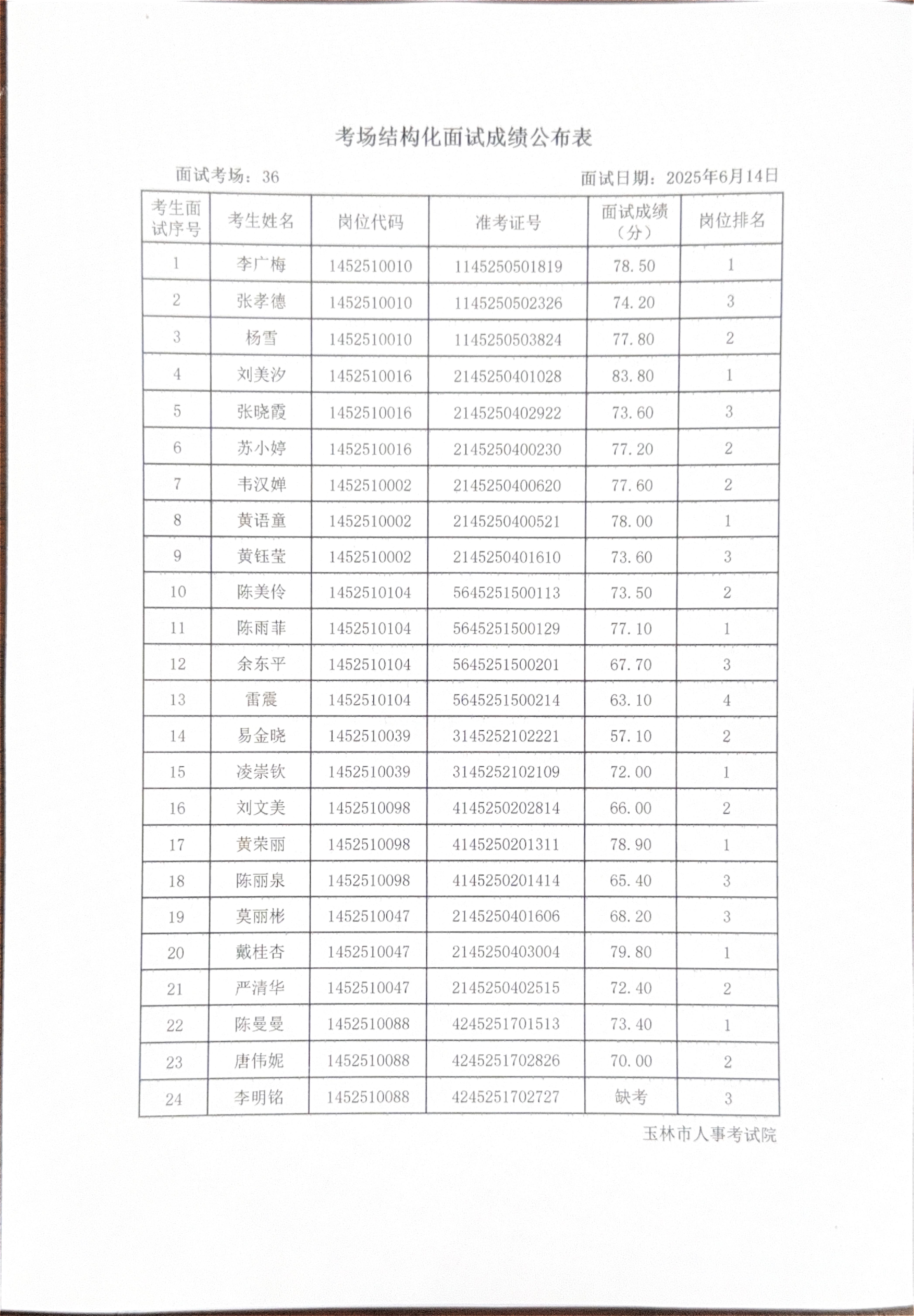 玉林市2025年度上半年市直(含玉州区、福绵区、玉东新区)事业单位公开招聘人员面试成绩公布(6月14日)
