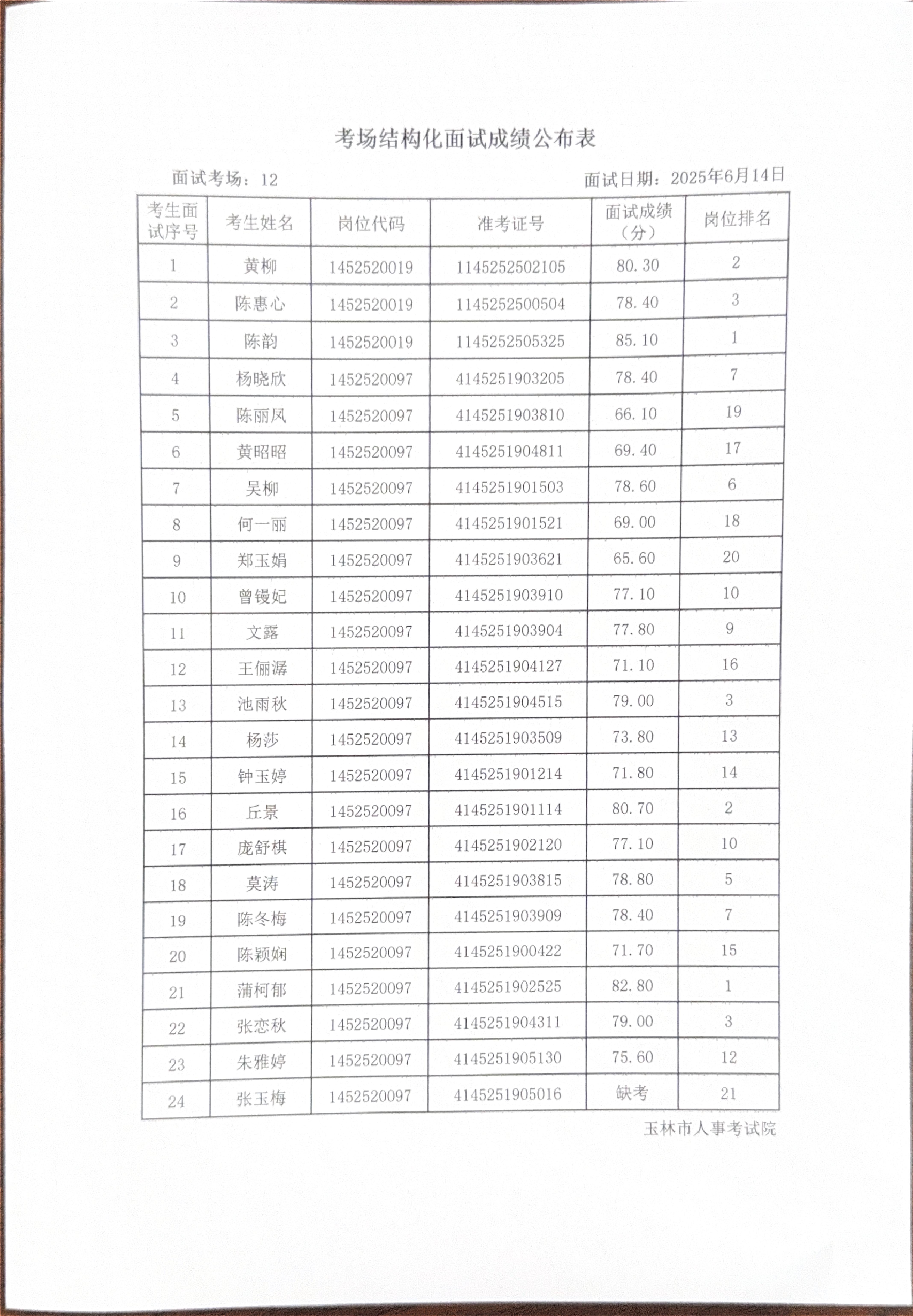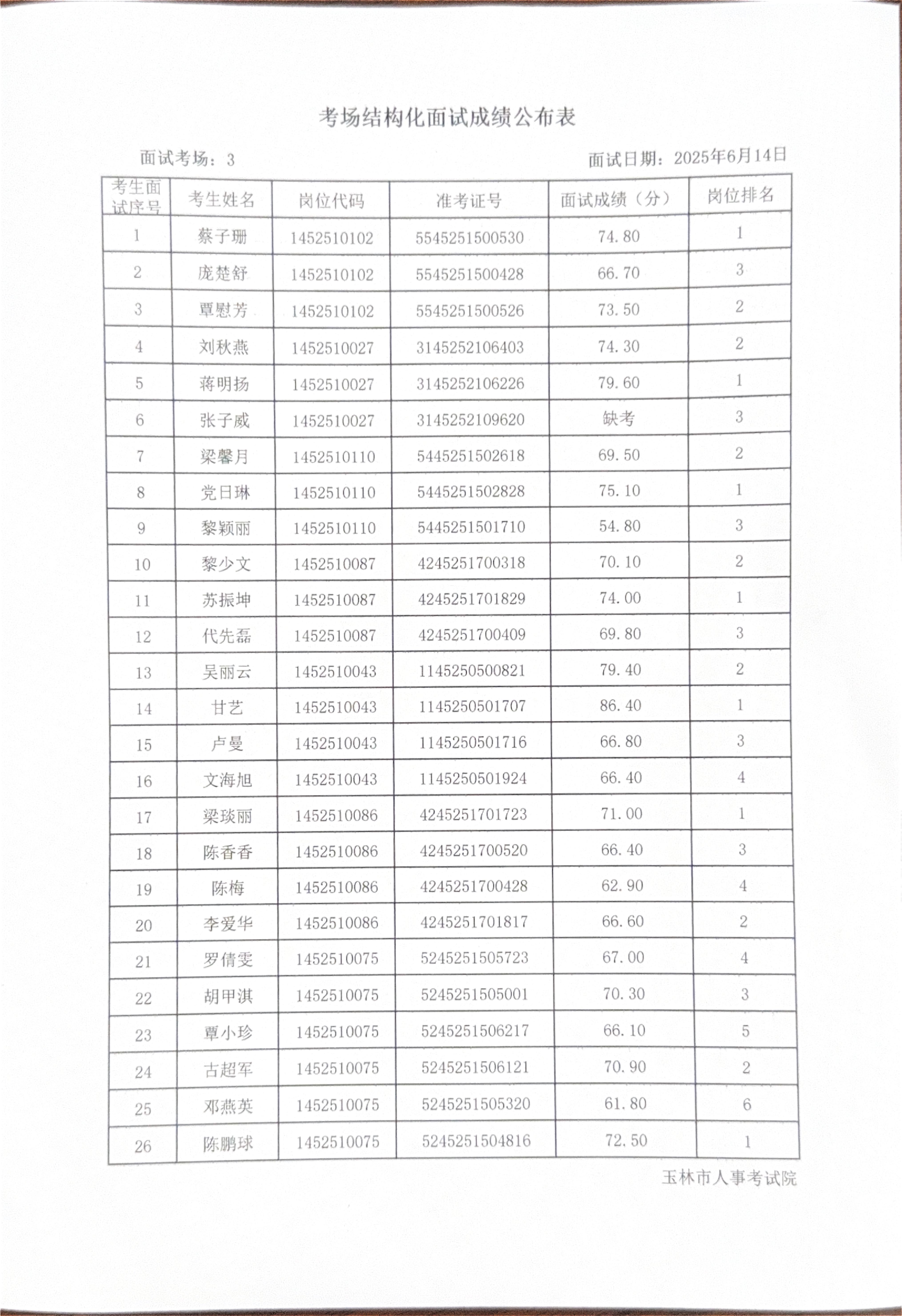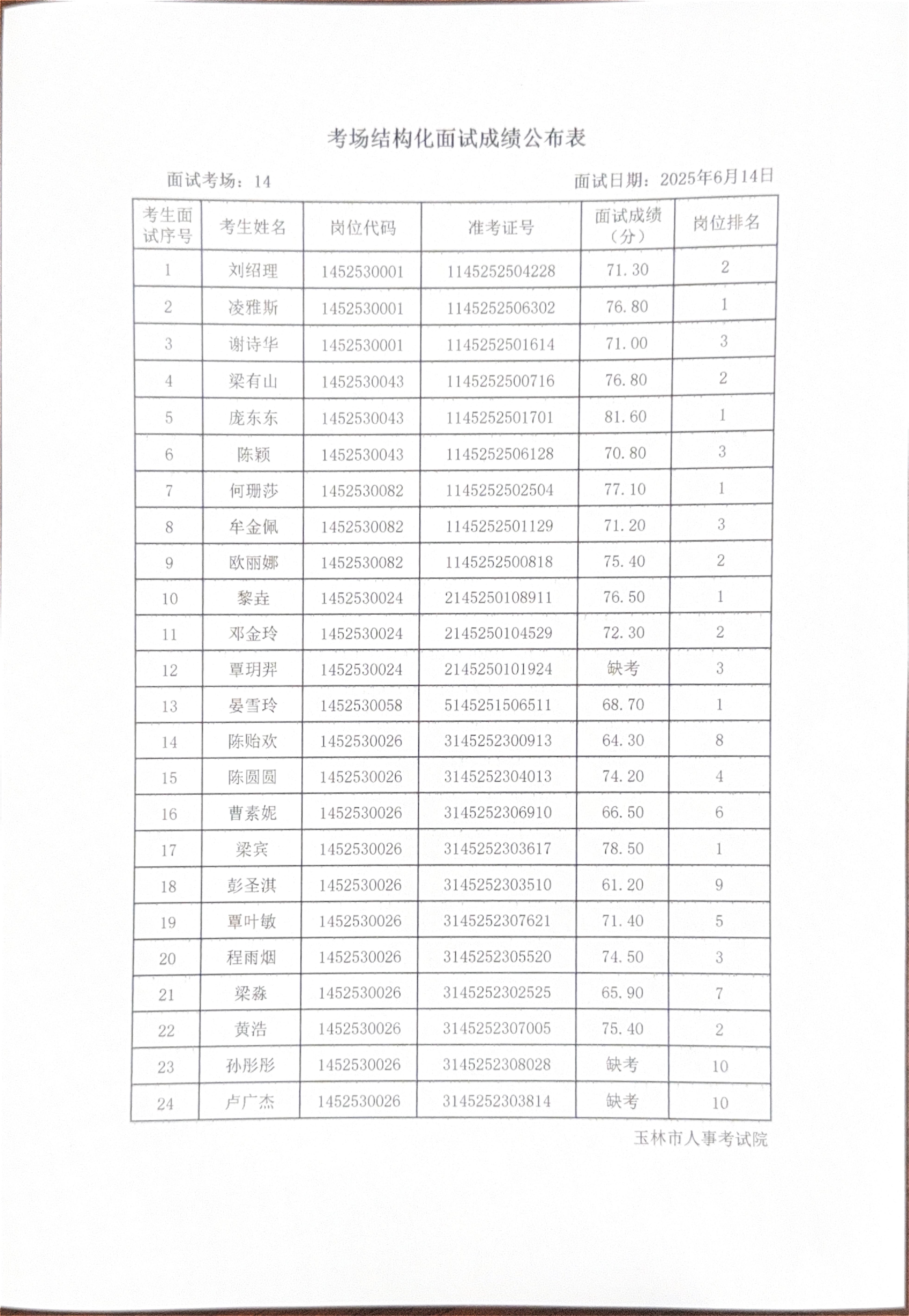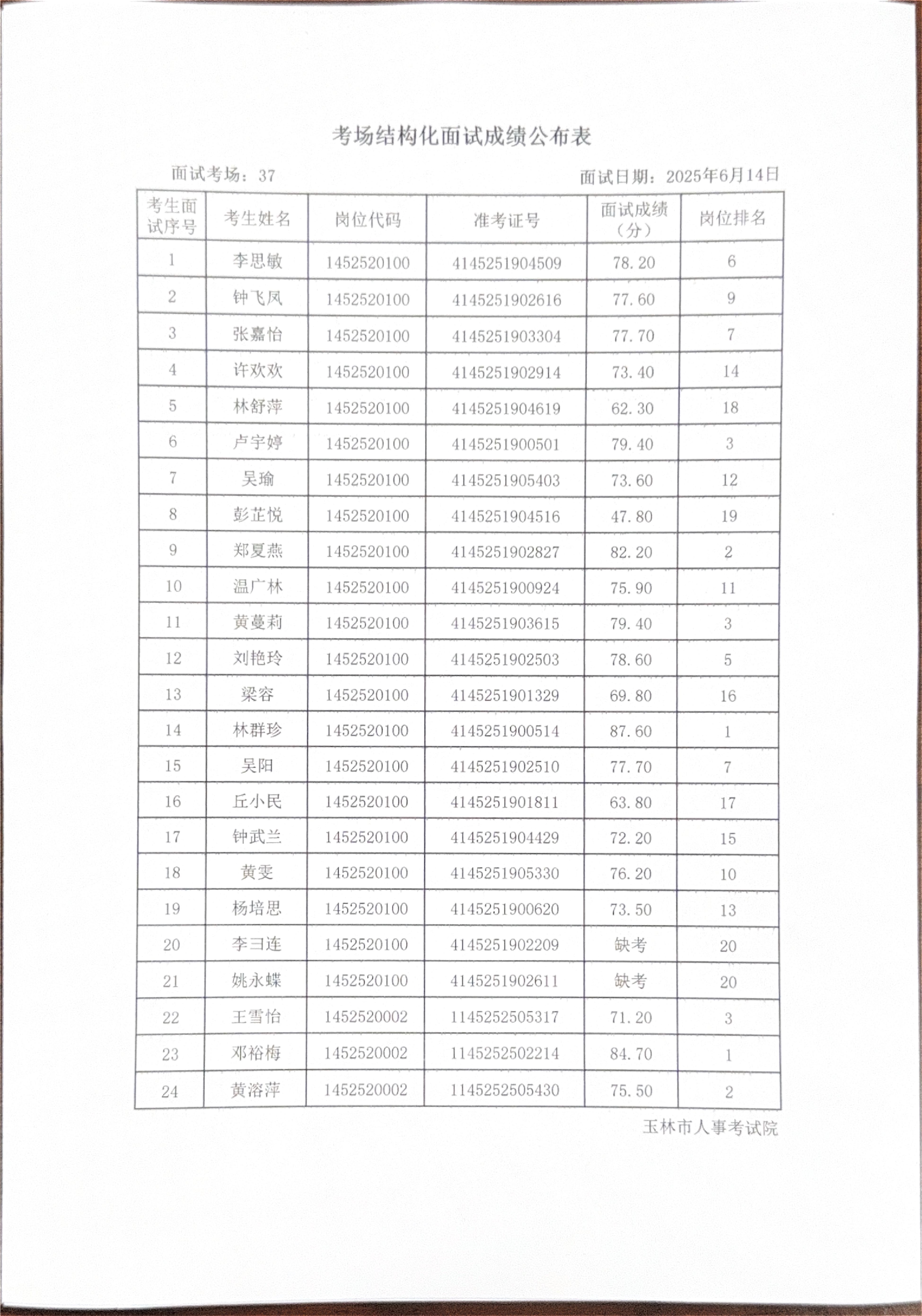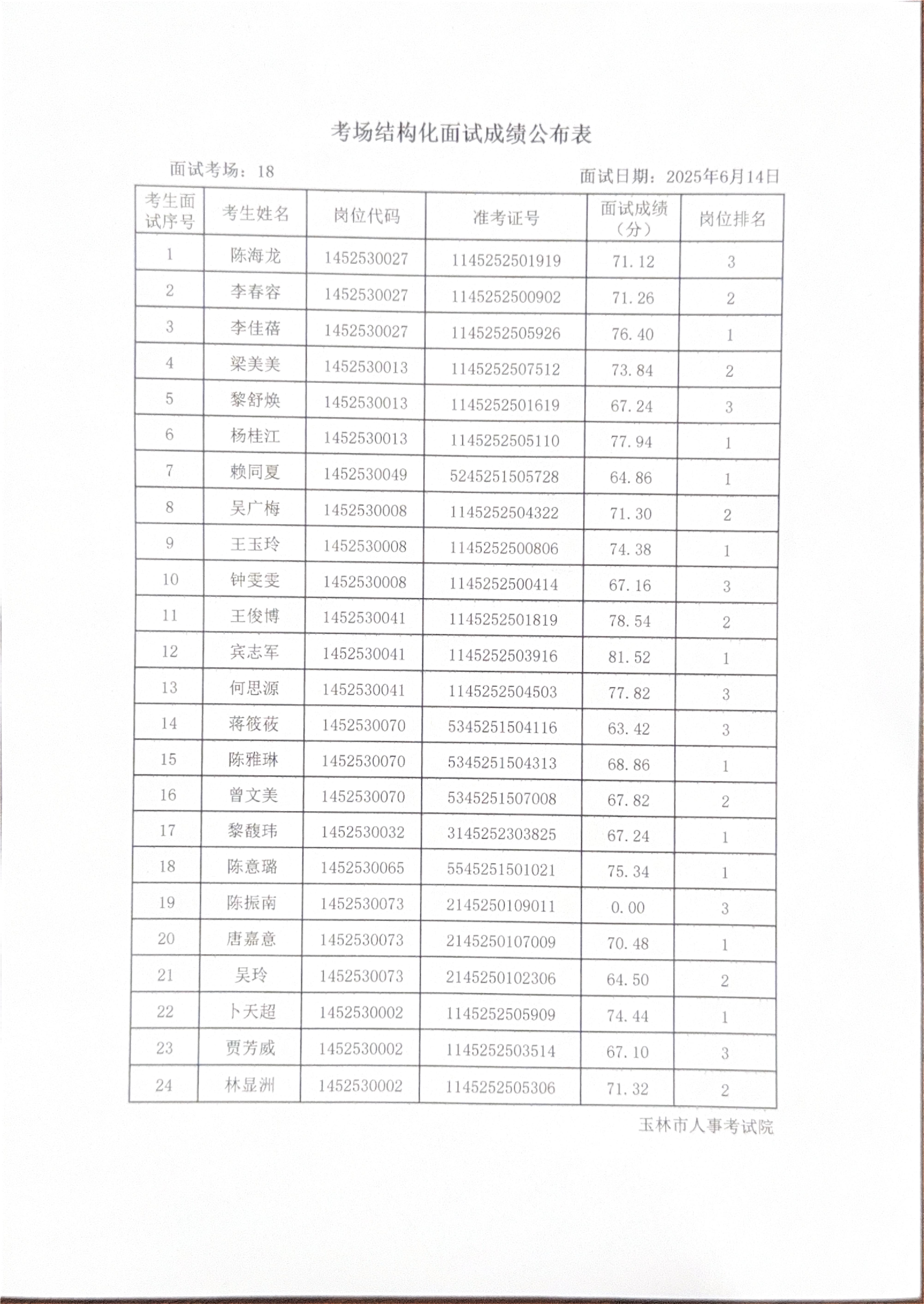 玉林市2025年度上半年市直(含玉州区、福绵区、玉东新区)事业单位公开招聘人员面试成绩公布(6月14日)