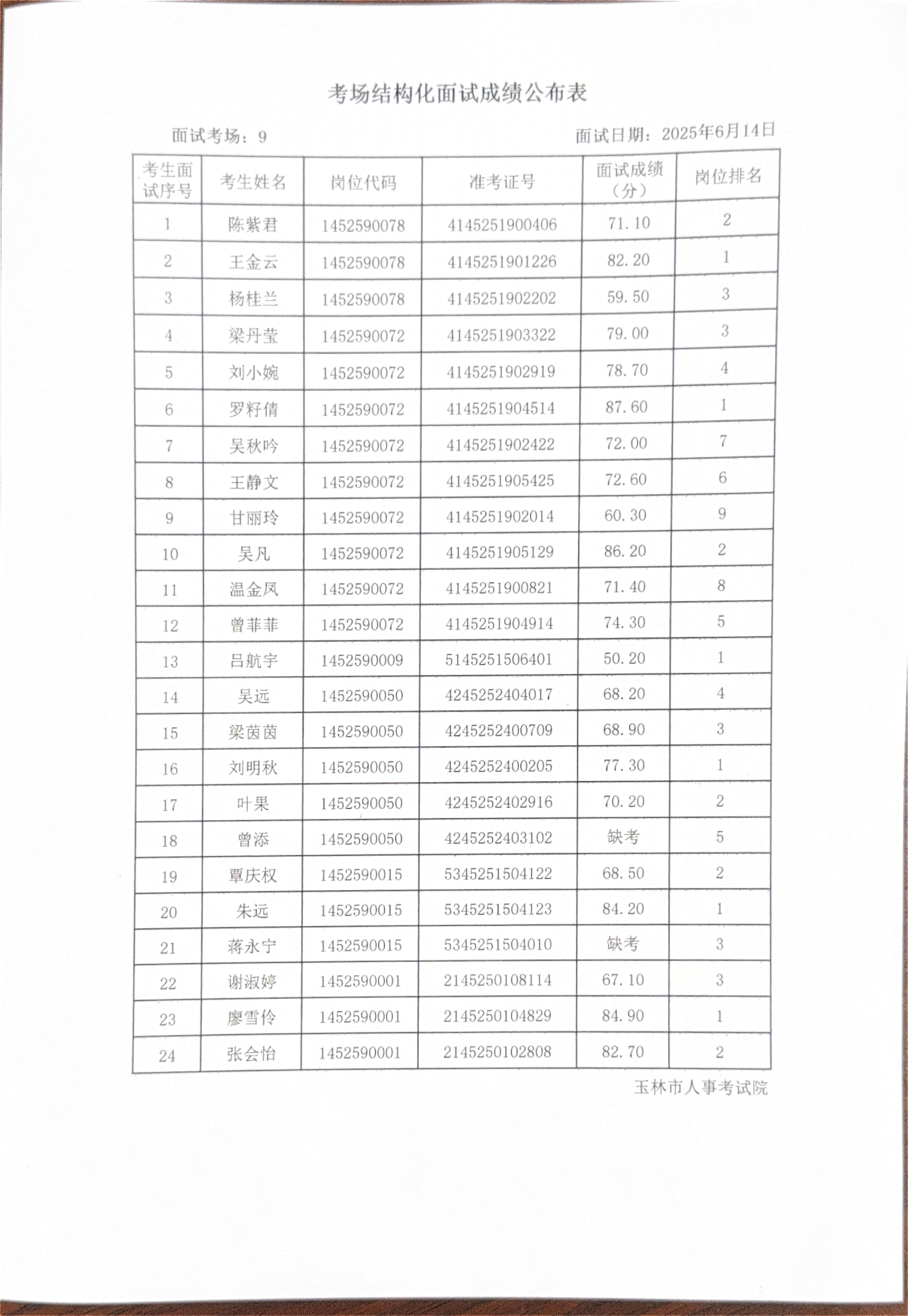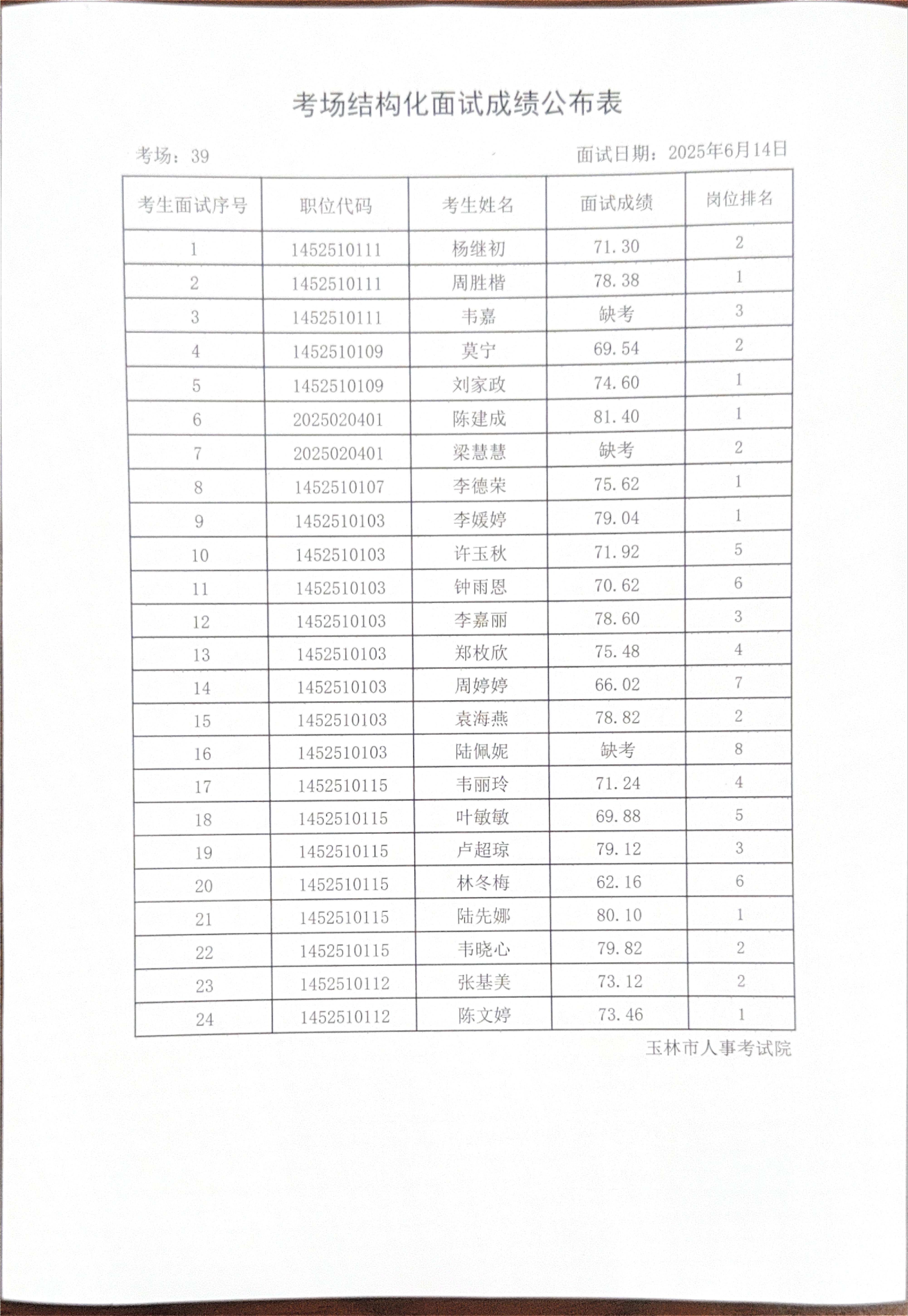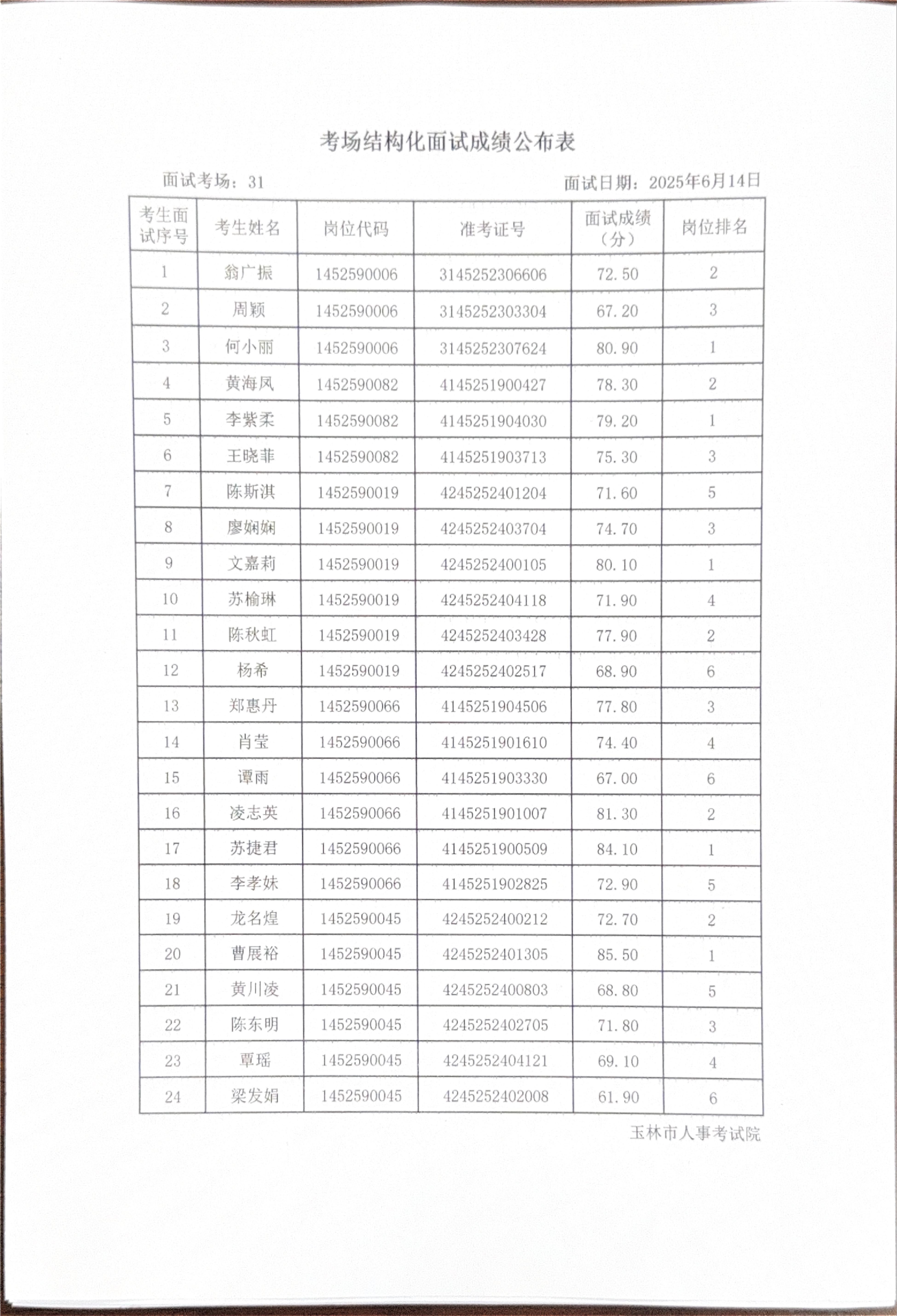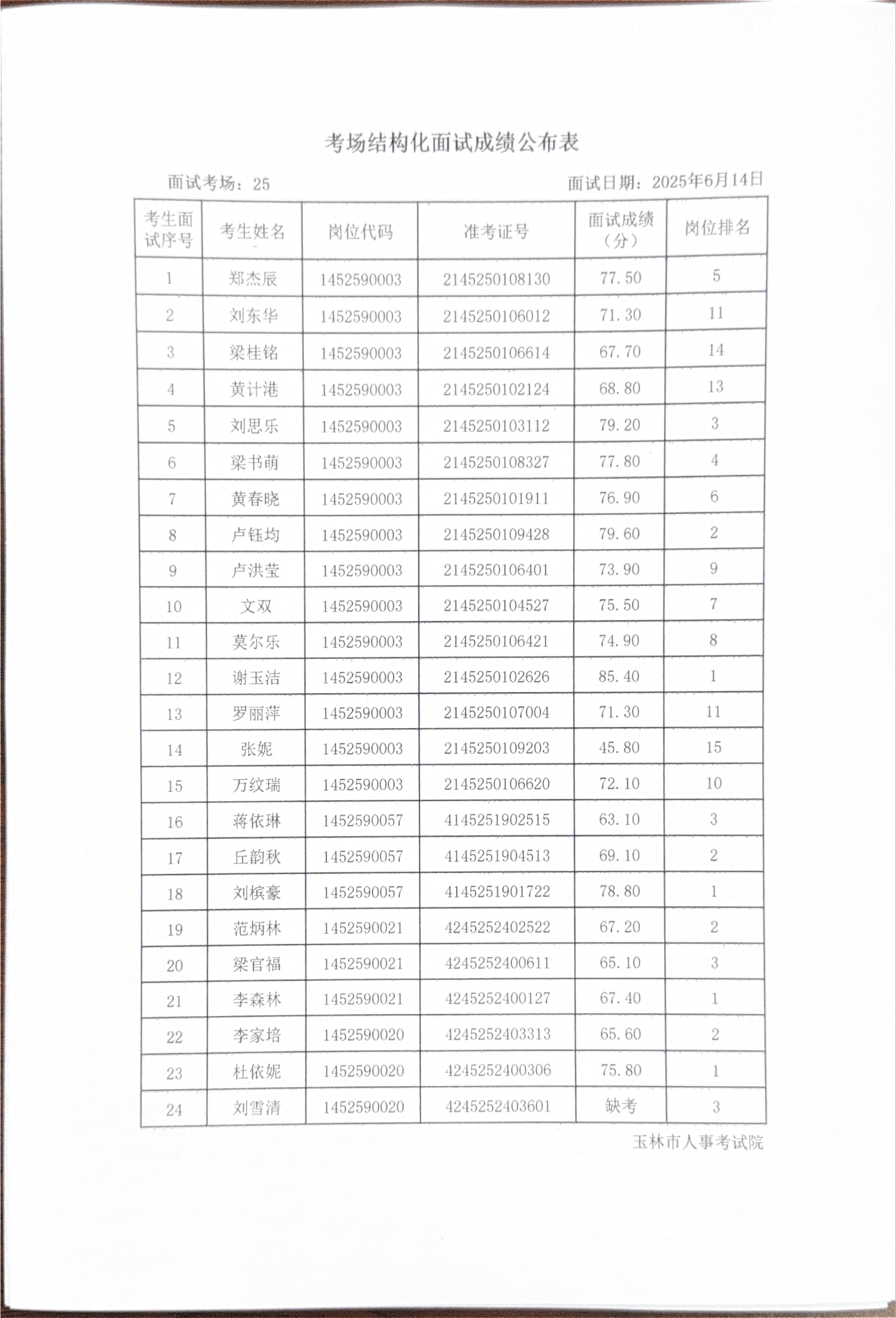 玉林市2025年度上半年市直(含玉州区、福绵区、玉东新区)事业单位公开招聘人员面试成绩公布(6月14日)