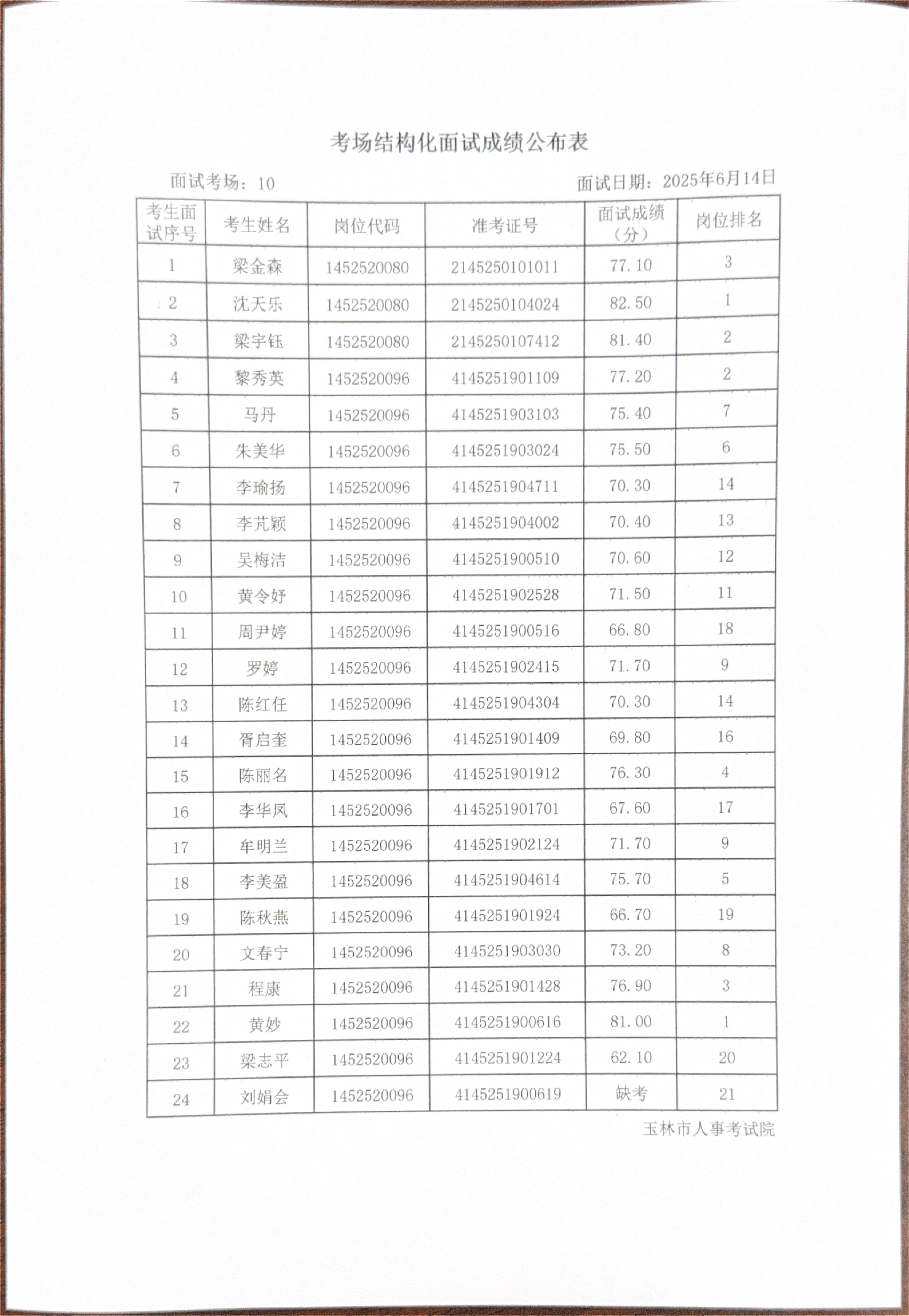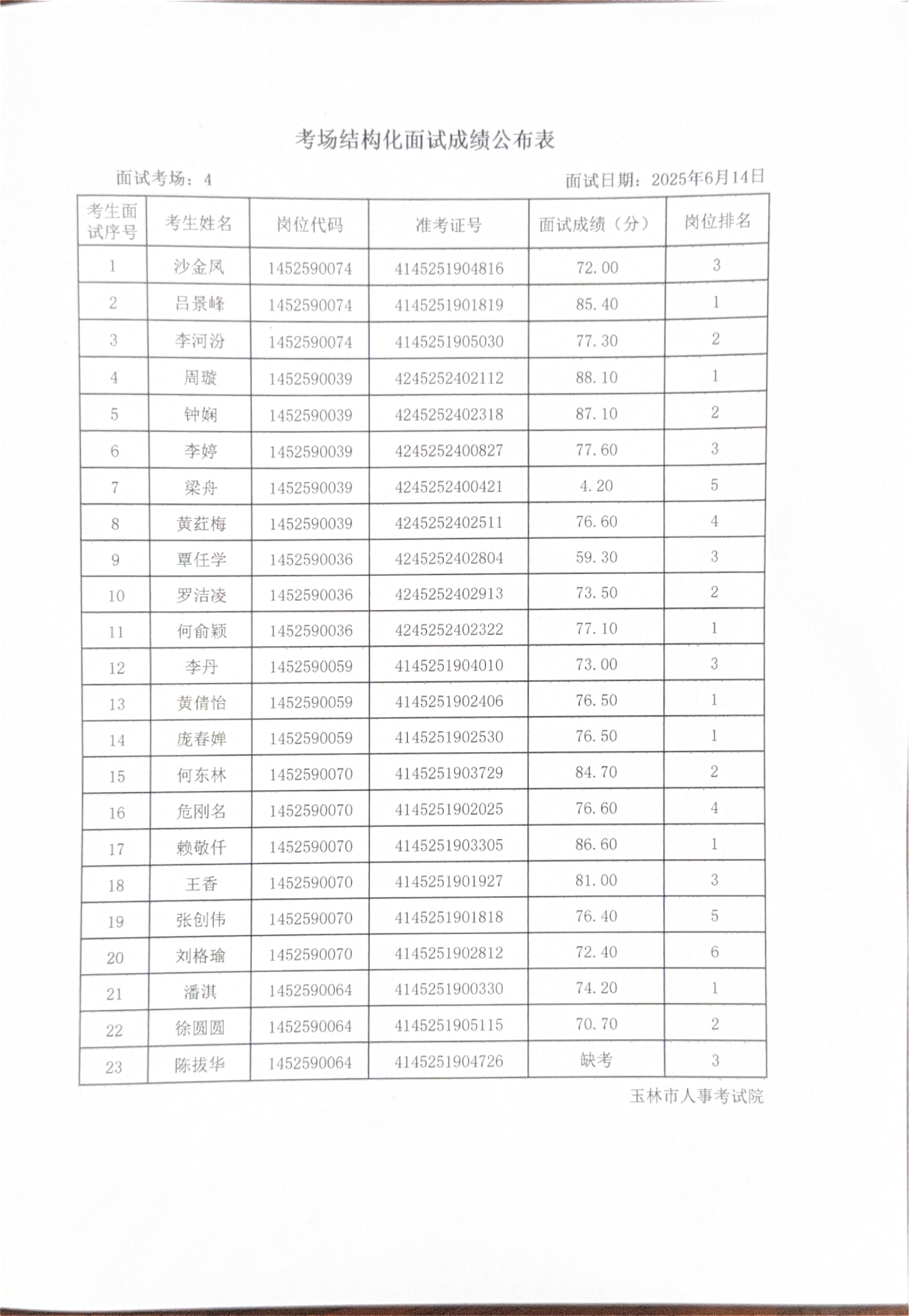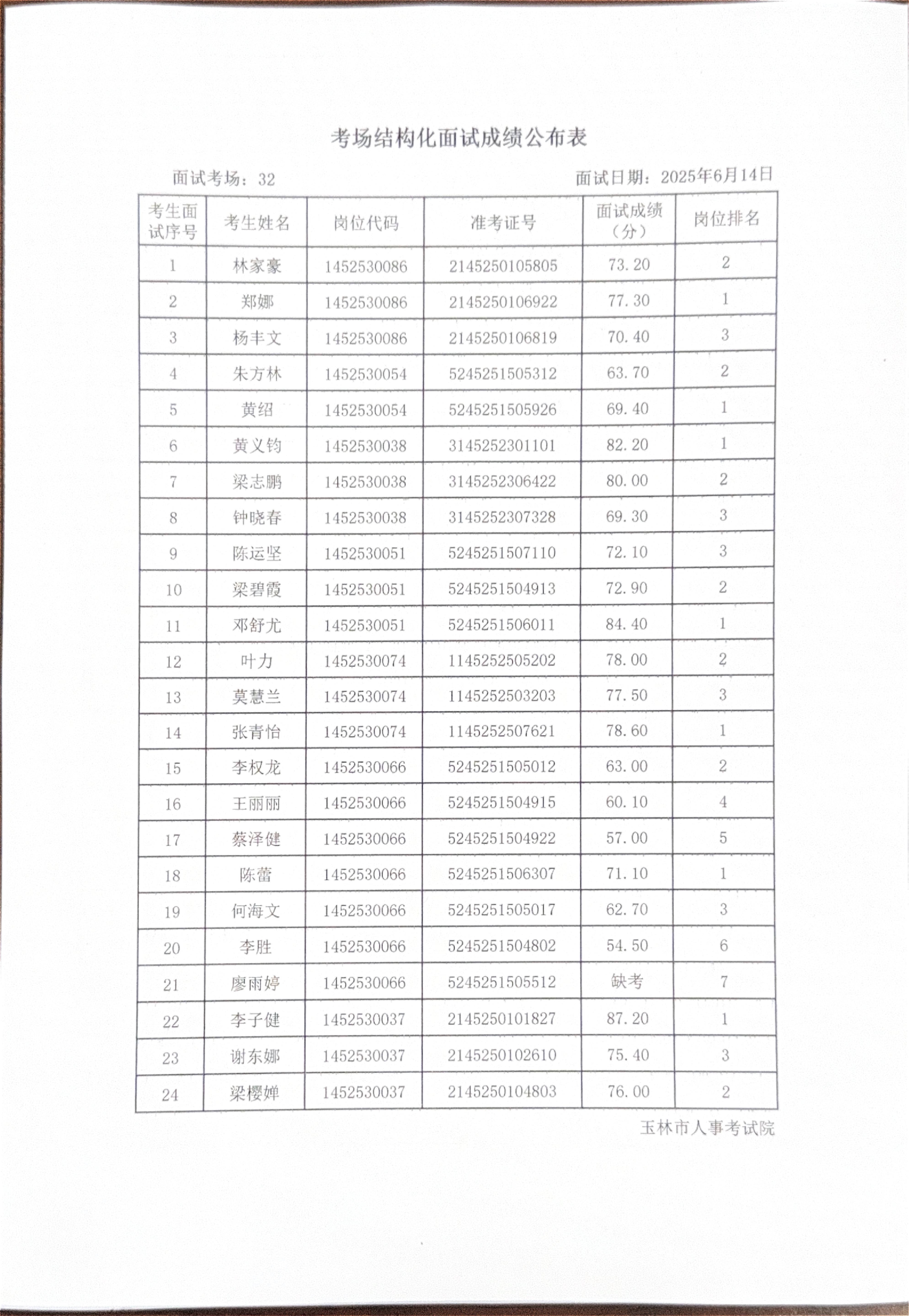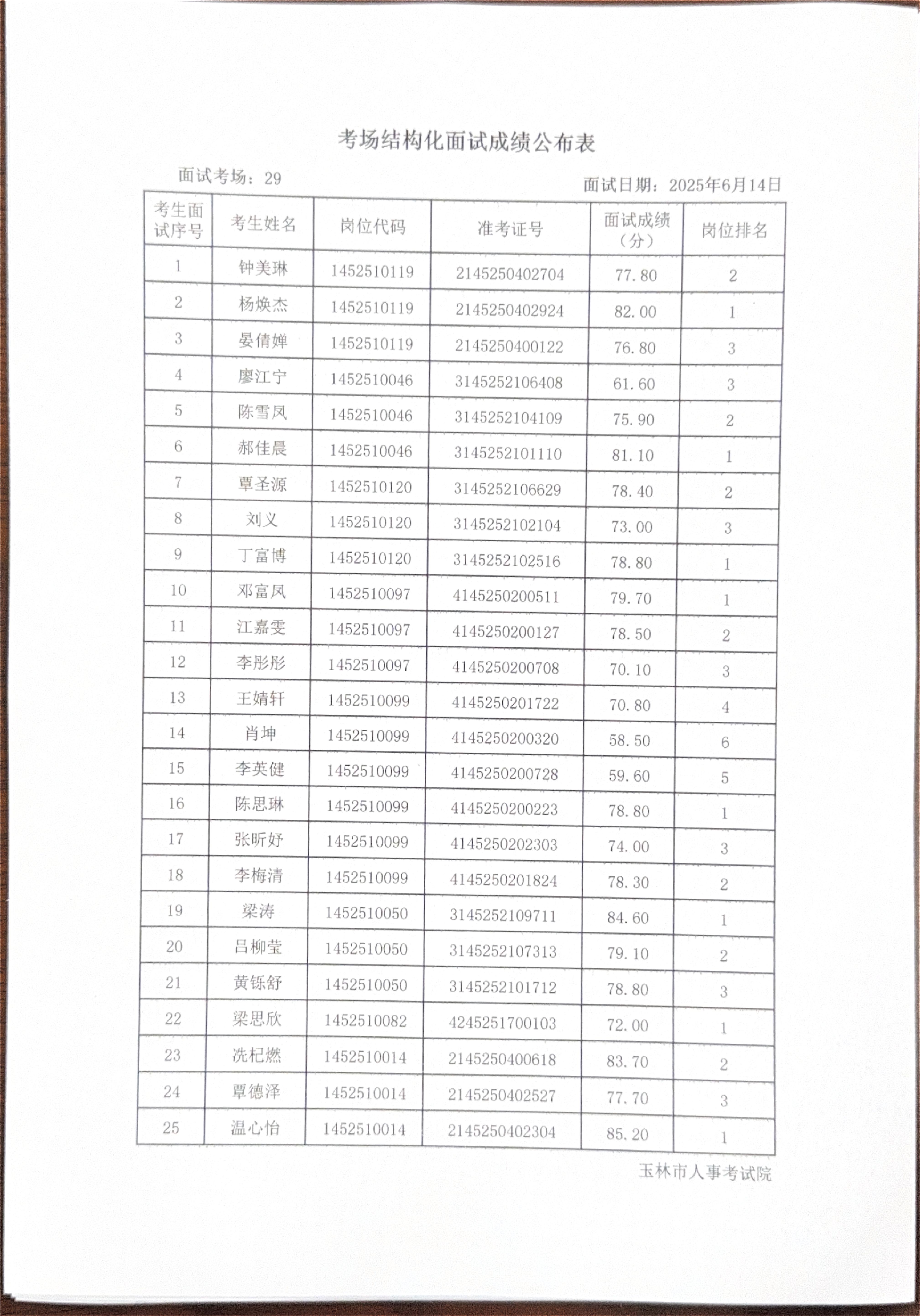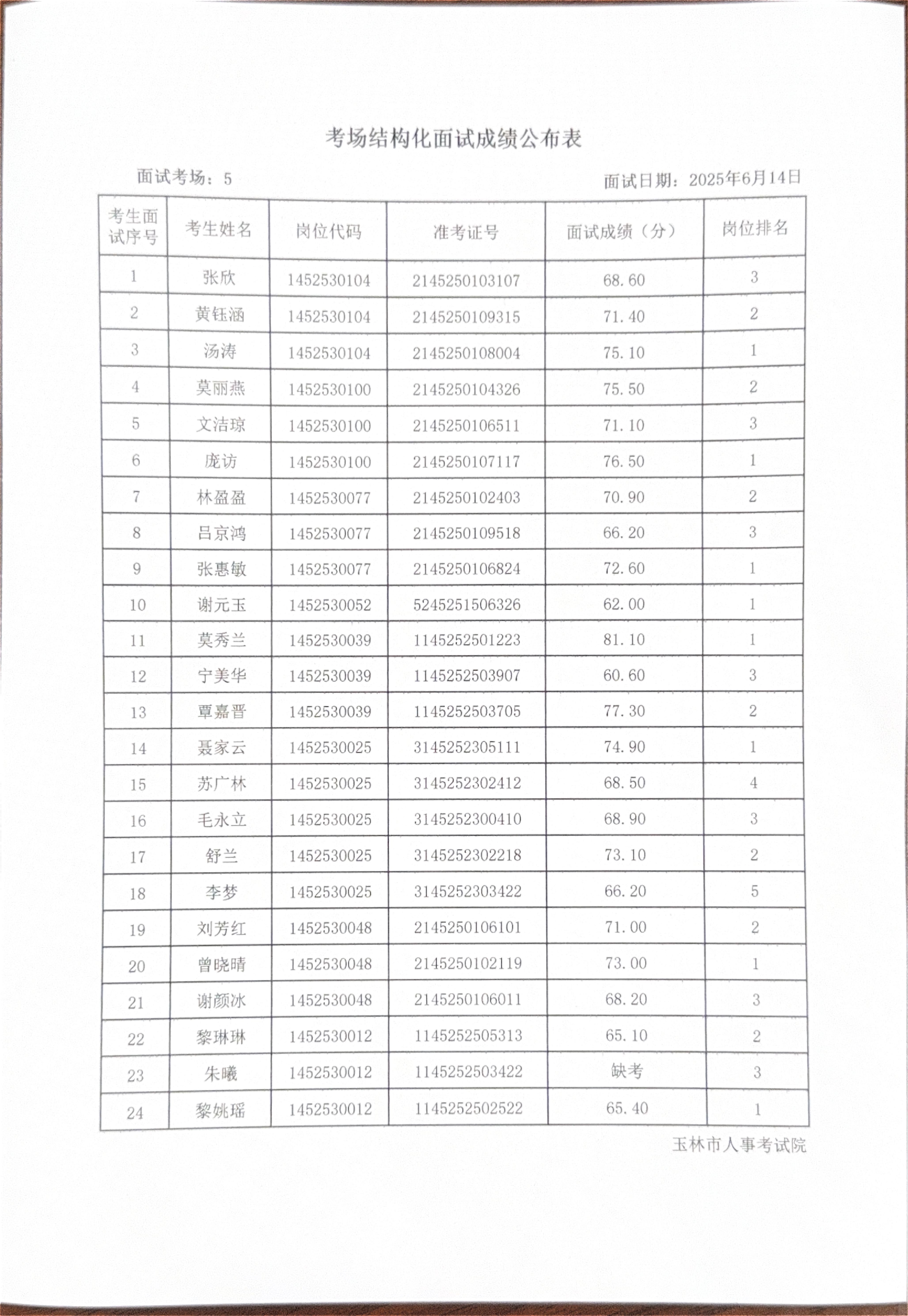 玉林市2025年度上半年市直(含玉州区、福绵区、玉东新区)事业单位公开招聘人员面试成绩公布(6月14日)