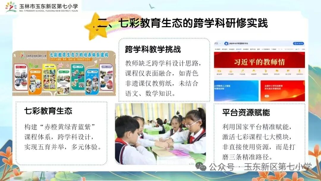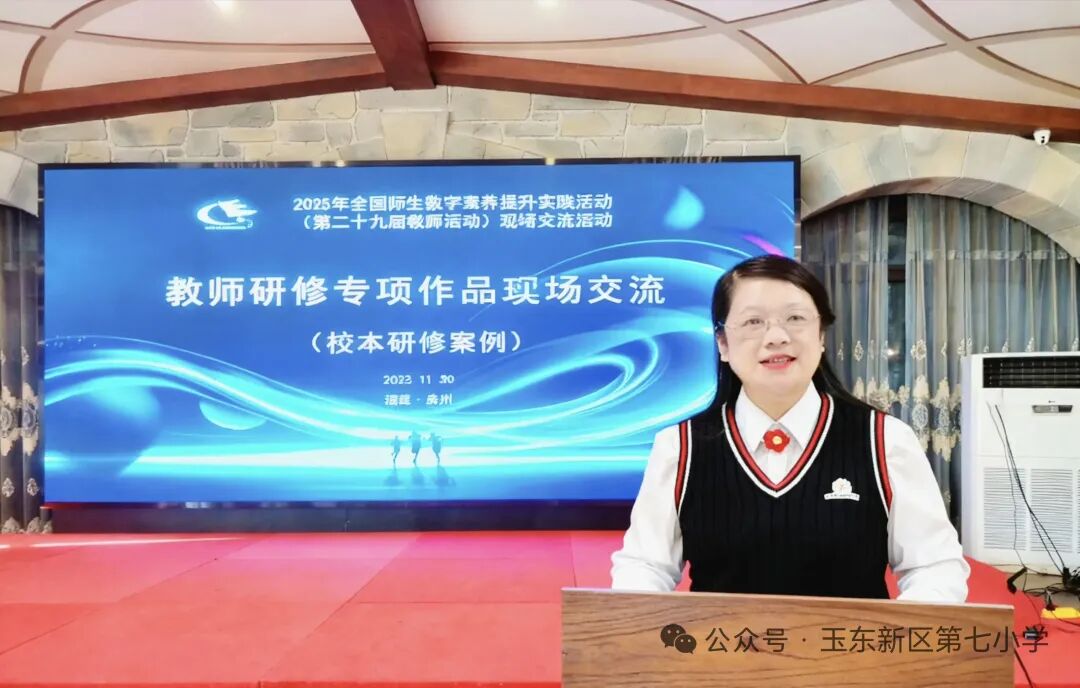近日,在由教育部教育技术与资源发展中心主办的2025年全国师生数字素养提升实践活动全国基础教育教师研修专项评选中,由玉东七小周佳、黄滟、梁日琼三位老师设计的教师校本研修案例《七彩课程融入:聚焦教师跨学科设计与学科素养提升》,经过多轮严格评审,从全国众多参评课例中脱颖而出,成功入选全国优秀展示课例,成为广西唯一入选该专项的小学组代表,并代表广西在活动中进行了现场展示与交流。