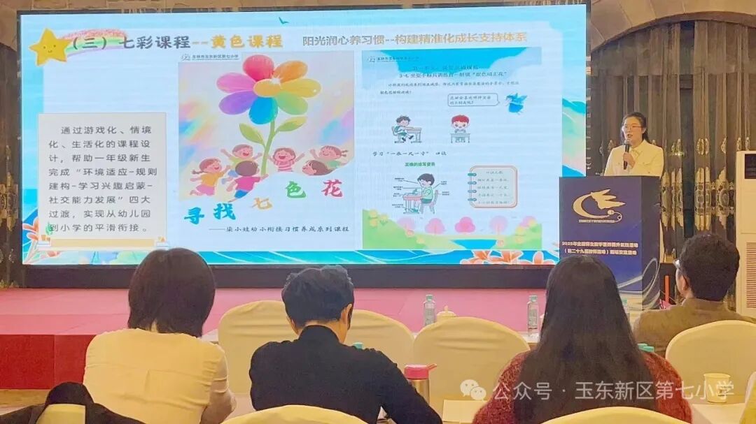 会上,玉东七小党支部副书记黄滟分享了该校依托国家中小学智慧教育平台,深耕“七彩教育生态”,完善七彩课程体系的跨学科研修实践故事。玉东七小通过构建“赤橙黄绿青蓝紫”七大模块的七彩课程体系,以“1学科+ 1技能”“学科素养+生活情境”的跨学科设计,让五育并举的目标转化为可感可学的多元体验的教育教学实践经验,得到了与会人员的广泛认可。