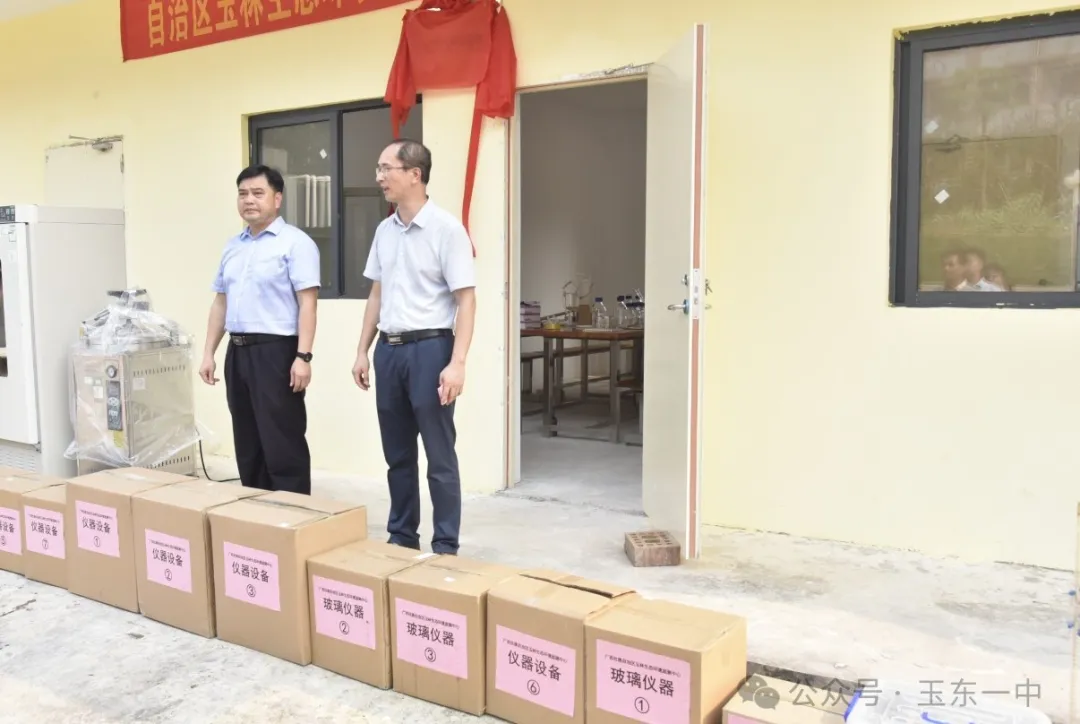 李锋主任和黄超校长共同为广西壮族自治区玉林生态环境监测中心与玉林市玉东新区第一初级中学“教学实践基地”揭牌。随后,李锋主任代表了广西壮族自治区玉林生态环境监测中心赠予我校了一批价值不菲的实验器材,包括一套先进的仪器设备。