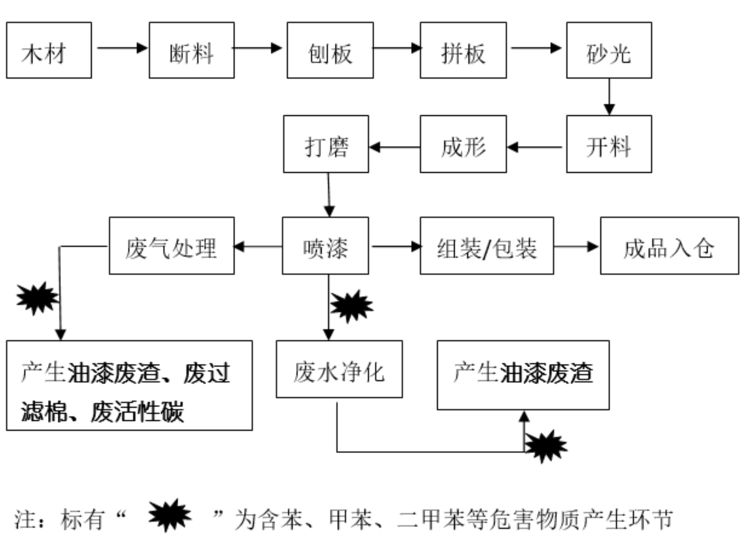 油漆废渣:油漆废渣是在废水净化系统和废气处理系统产生的固体危险废物。收集后暂时存放于专用危险废物房,存到一定量后,转移给有资质的单位处置,油漆废渣属于危险废物HW12类,代码900-252-12。 废过滤棉:在废气净化系统中用于过滤和吸附有害物质,当使用到一定时间后,因其过滤和吸附的作用已经失效,需要更换新的。报废的过滤棉暂时存放于专用房,存到一定量后,转移给有资质的单位处置,废过滤棉属于危险废物HW49类,代码900-041-49。 废活性碳:在废气处理系统中用于吸附有害物质,当使用到一定时间后,因其过滤和吸附的作用达到饱和状态,需要更换新的。报废的活性碳暂时存放于专用危废房,存到一定量后,转移给有资质的单位处置,废过滤棉属于危险废物HW49类,代码900-041-49。 | ||||
